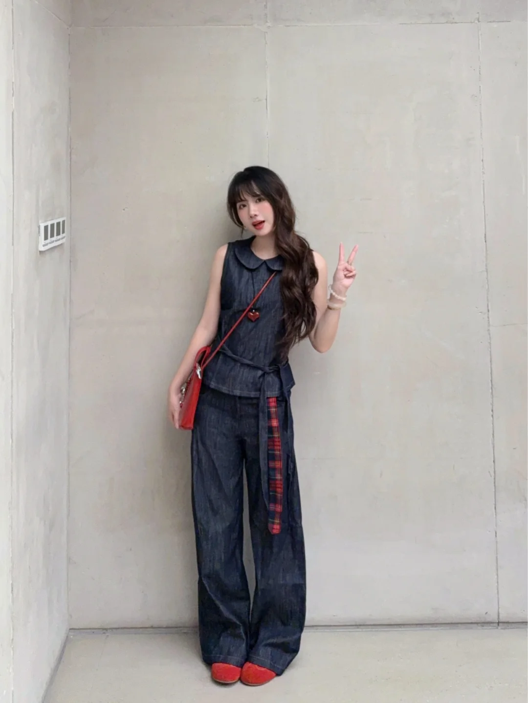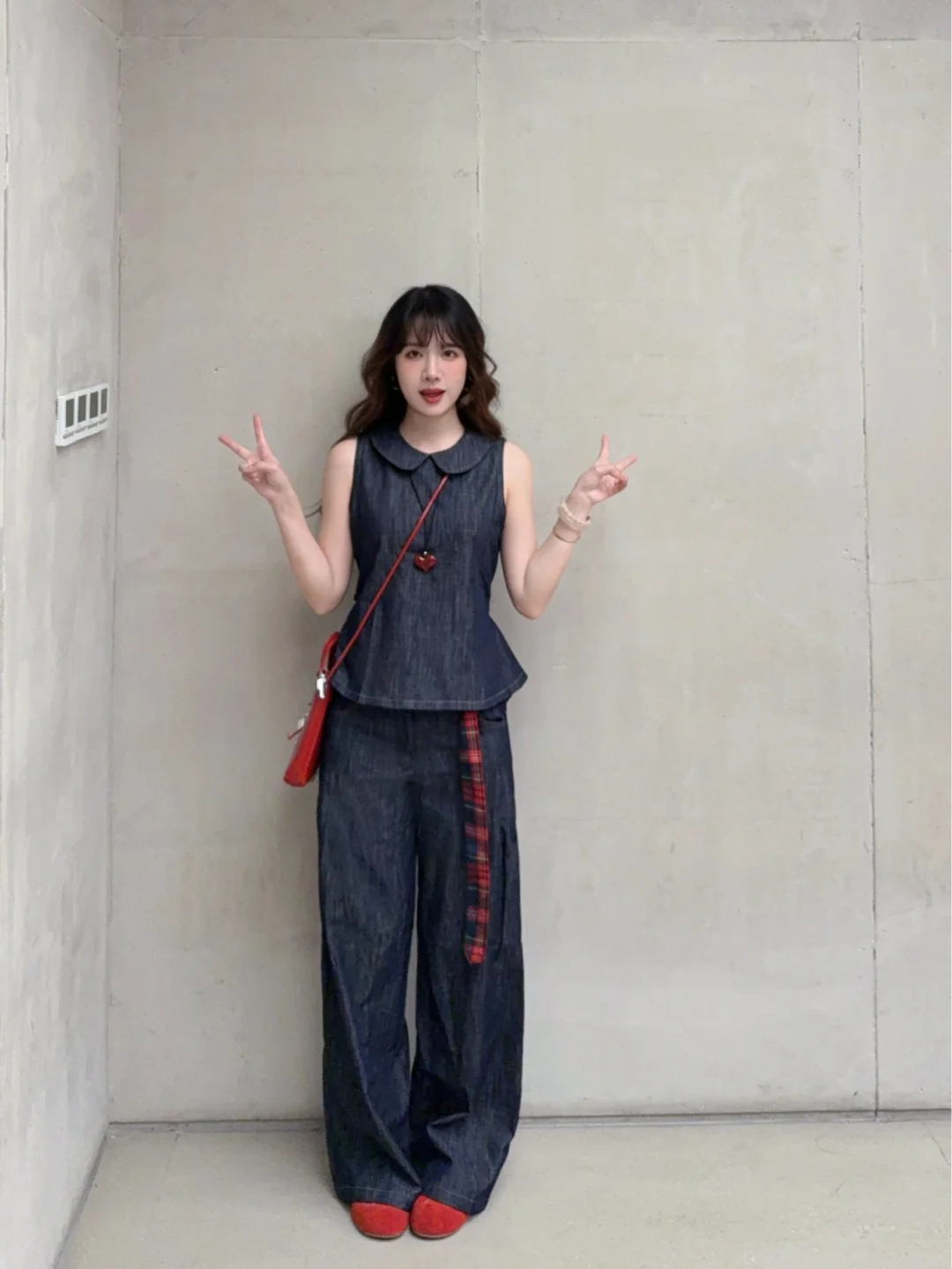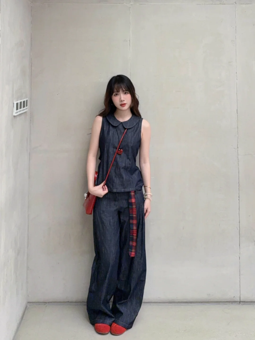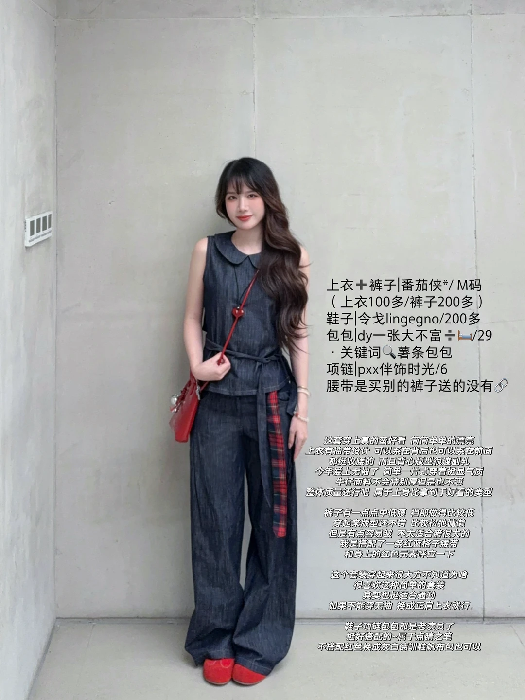 168/106 很简单耐看的套装~ 这套最近也挺火的 实物上身很好看 参考搭配思路也可以 娃娃领衬衫(有袖无袖都可以)/牛仔背心 ➕原色拖地牛仔裤 简单松弛耐看 很显气质的一套 大大方方的简简单单就很好看 换成有袖的上衣更适合通勤 上半身搭配收腰衬衫也是很好看的 配饰也可以换成黑白灰蓝色黄色 深色系搭配任意配色都是合适的