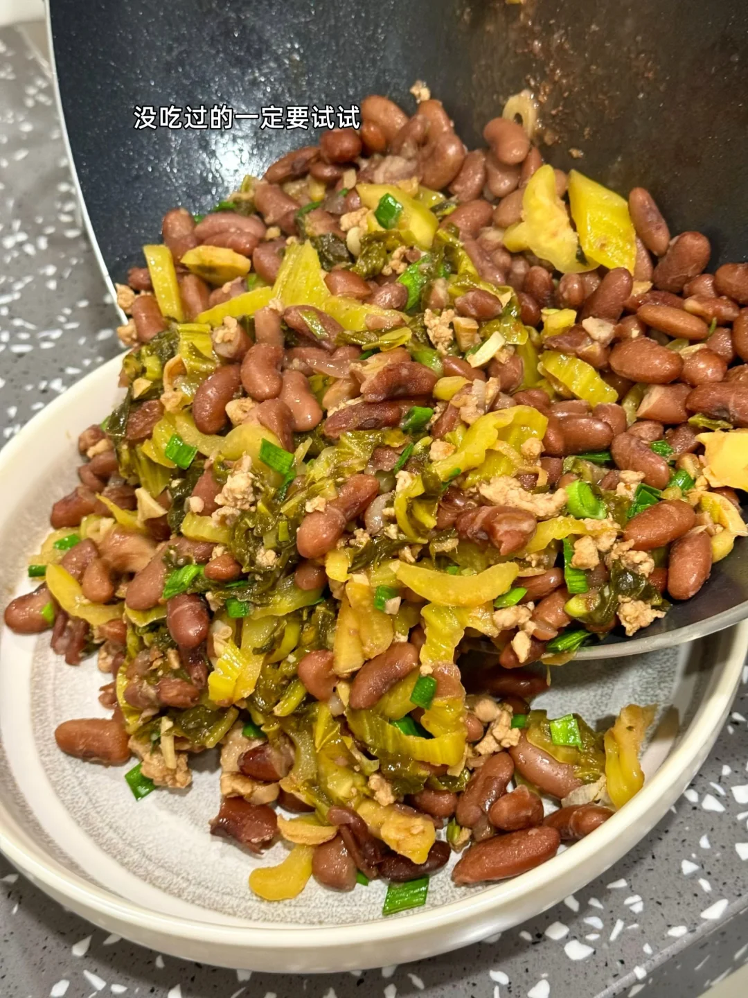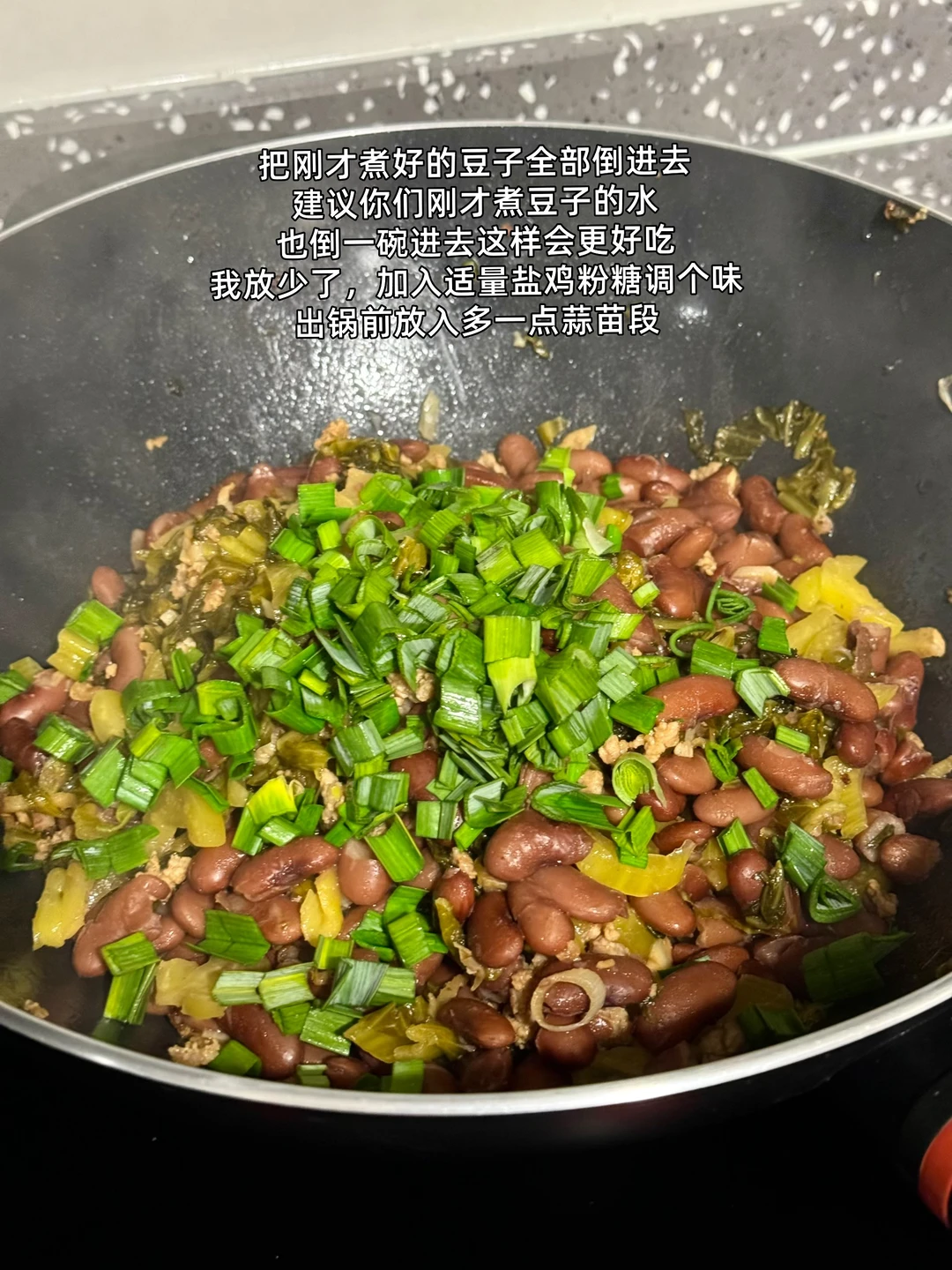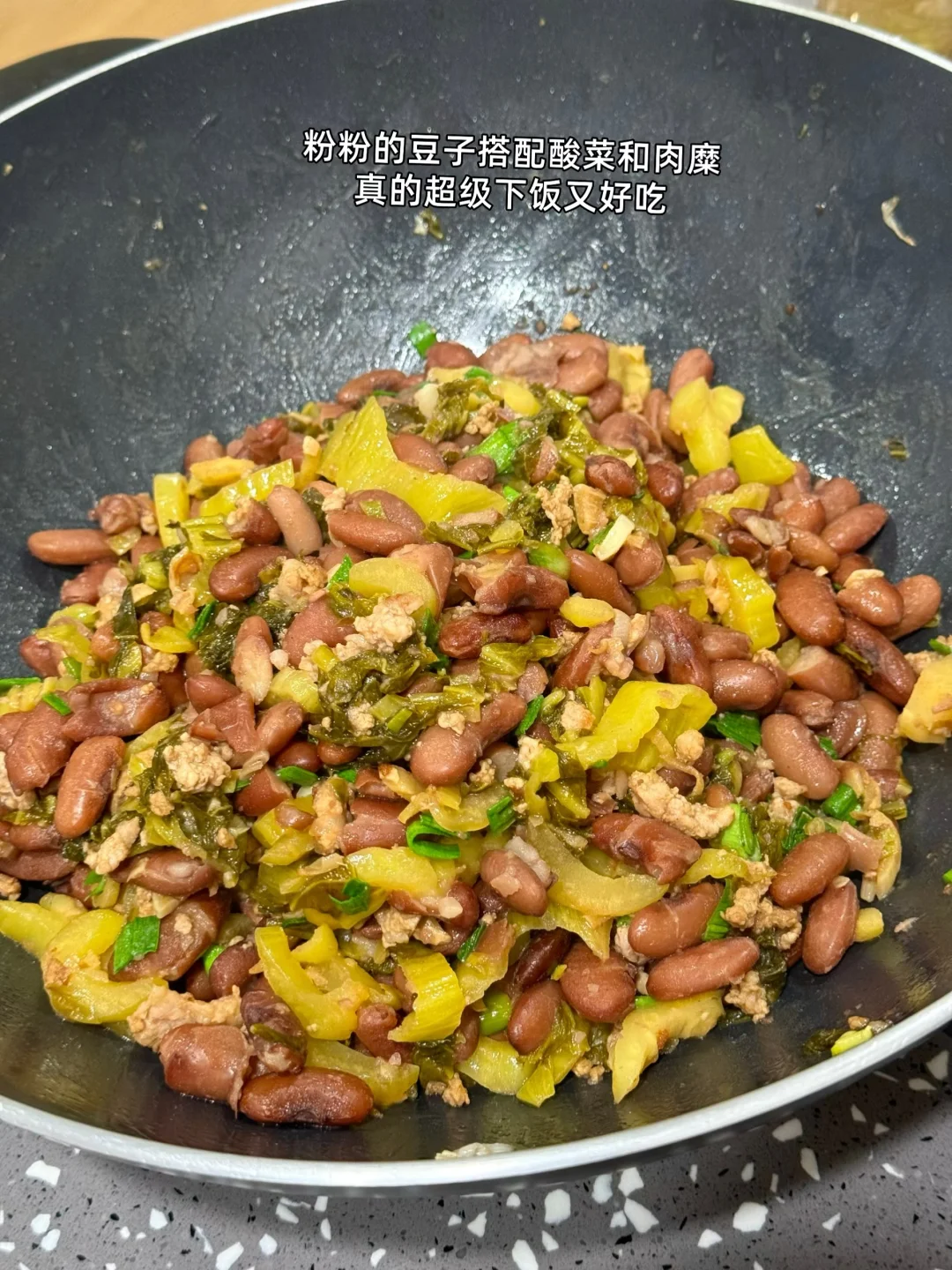 第一次吃到这道菜是和云南的闺蜜去吃他们老家菜吃完才知道原来这两个材料的组合味道这么好吃这么下饭 1. 豆子最好提前泡透更容易煮哦 2. 这家的酸菜买了好多次了挺好吃的记得提前用冷水多泡一会儿中间换换水就好了 3. 大蒜生姜切末刚好有蒜苗也切了一点酸菜切成细丝 4. 泡好的豆子用高压锅多压一会儿上气之后我压的十分钟感觉还是有点硬 5. 我还放了一点猪油进去会更香哦 6. 小火爆香大蒜生姜末然后把切好的肉糜放进去滑炒熟加入一勺料酒一丢丢老抽上个色 7. 把切好的酸菜丝倒进去翻炒匀炒个三四分钟 8. 把刚才煮好的豆子全部倒进去建议你们刚才煮豆子的水也倒一碗进去这样会更好吃我放少了,加入适量盐鸡粉糖调个味出锅前放入多一点蒜苗段 9. 粉粉的豆子搭配酸菜和肉糜真的超级下饭又好吃