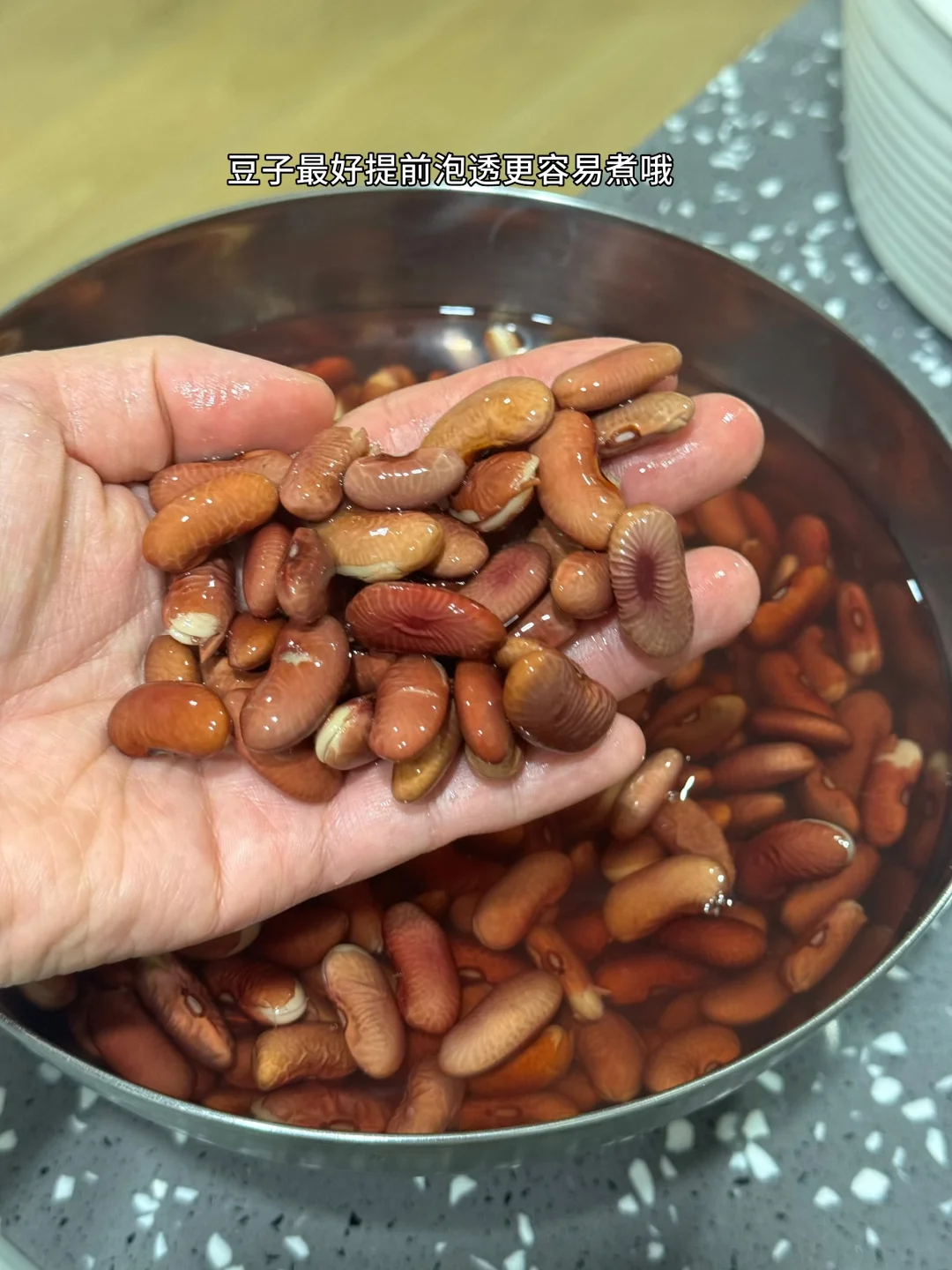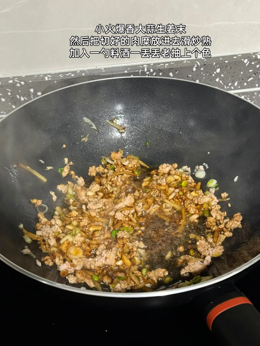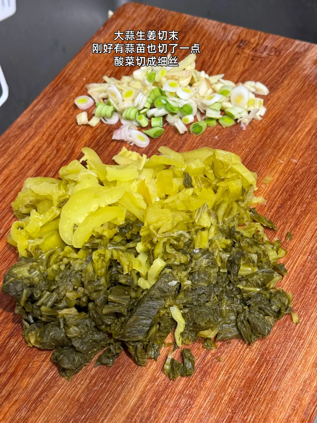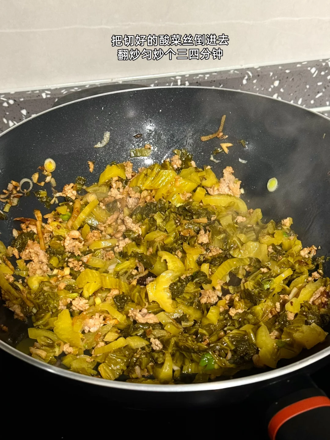 第一次吃到这道菜是和云南的闺蜜去吃他们老家菜吃完才知道原来这两个材料的组合味道这么好吃这么下饭 1. 豆子最好提前泡透更容易煮哦 2. 这家的酸菜买了好多次了挺好吃的记得提前用冷水多泡一会儿中间换换水就好了 3. 大蒜生姜切末刚好有蒜苗也切了一点酸菜切成细丝 4. 泡好的豆子用高压锅多压一会儿上气之后我压的十分钟感觉还是有点硬 5. 我还放了一点猪油进去会更香哦 6. 小火爆香大蒜生姜末然后把切好的肉糜放进去滑炒熟加入一勺料酒一丢丢老抽上个色 7. 把切好的酸菜丝倒进去翻炒匀炒个三四分钟 8. 把刚才煮好的豆子全部倒进去建议你们刚才煮豆子的水也倒一碗进去这样会更好吃我放少了,加入适量盐鸡粉糖调个味出锅前放入多一点蒜苗段 9. 粉粉的豆子搭配酸菜和肉糜真的超级下饭又好吃
