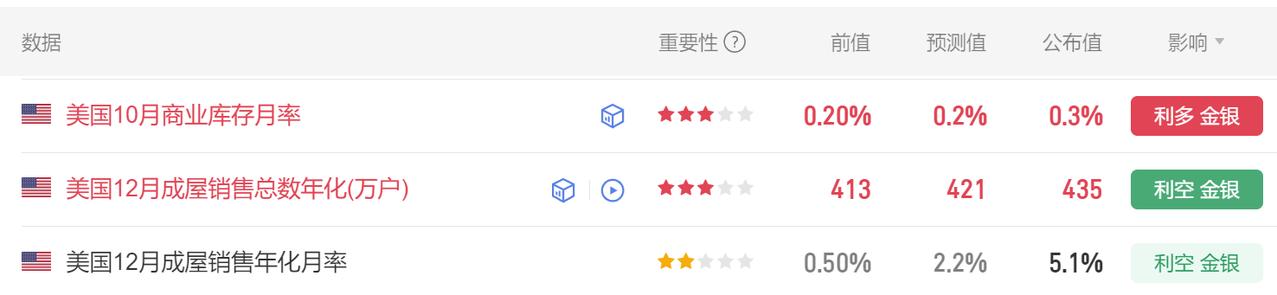 今晚多项美国经济数据公布。 首先美国12月成屋销售总数年化435万户, 市场预期421万户,前值由413万户修正为414万户。 其次美国10月商业库存月率 0.3%, 市场预期0.2%,前期数值0.20%。 最后美国12月成屋销售年化月率 5.1%, 市场预期2.2%,前值由0.50%修正为0.7%。 这三项数据有利多金价的, 也有利空金价的, 数据公布以后, 国际金价先回撤,然后反弹上涨十几美元。