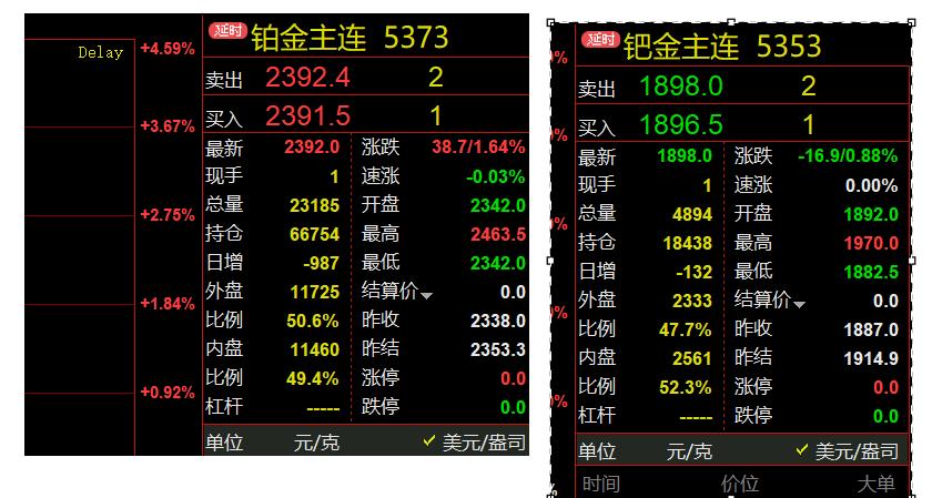 我们知道周三, 广期所的钯金和铂金 价格大幅上涨, 那么明天他们能否继续上涨? 先看下国际钯金和铂金价格。 纽约交易所的铂金期货 报价2392美元,上涨1.64%; 钯金期货主连报价1898美元, 较上一日下降16.9美金, 不过跌幅不大,仅为0.88%。 他们一个上涨,一个下跌, 估计对明天国内相关品种产生一定影响!