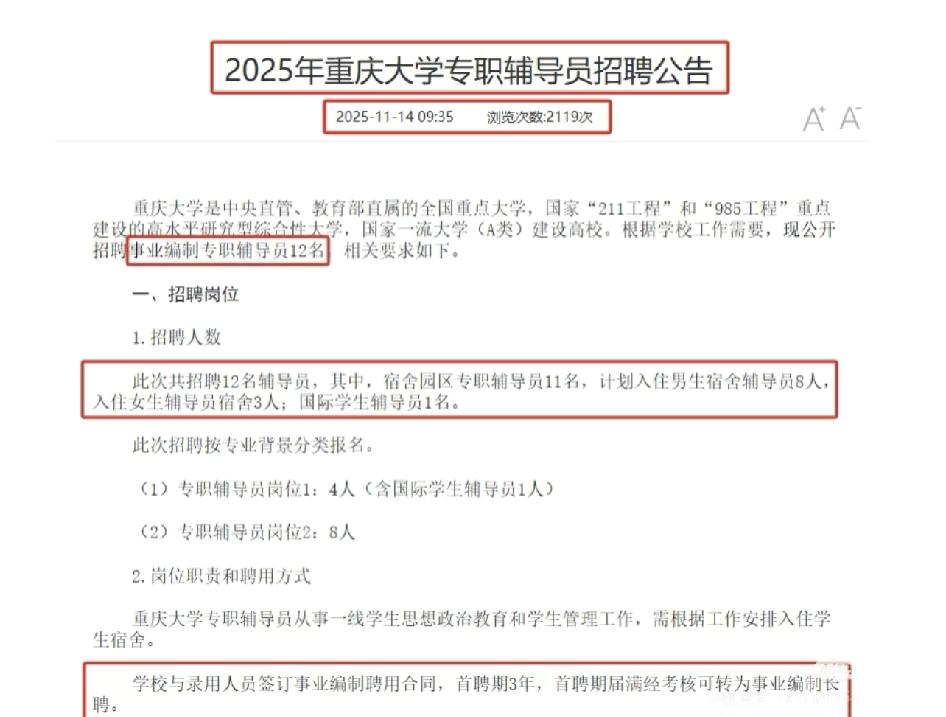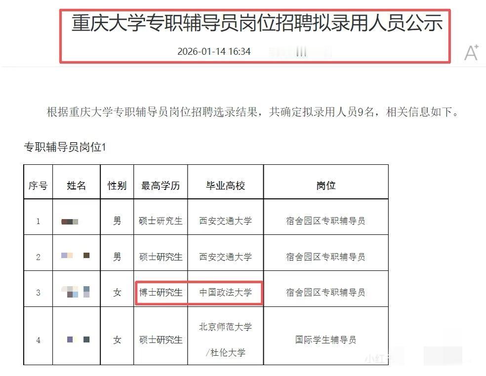 重庆大学2025辅导员公示!硕士全员985! 1、硕士:1人北大,1人北师大,2人西安交大,4人重大; 2、博士:1人中国政法大学。 3、原计划招聘12人,这次公示9人,宁缺毋滥。