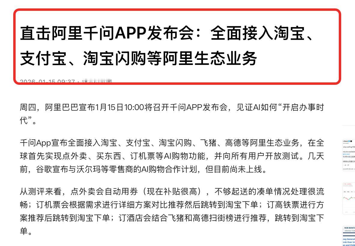 国内传来一条消息,打了谷歌、沃尔玛、亚马逊等公司懵了。一切发生的太快,不仅外国人没想到,估计中国人也没想到。 国外的AI发展了这么多年,还停留在参数有多牛,模型有多大层面。但阿里千问APP仅仅上线两个月左右的时间,就直接大面积应用,用到了服务大众,用到了购物层面。 1月15日的消息显示, 千问APP接入了阿里旗下的应用,支付宝、高德、淘宝闪购、飞猪等一大批覆盖人们衣食住行娱等应用,都在范围之内,同时还上线了400多项新功能,全部用于社会服务方面。 这么一来的话,往后购物、点外卖、甚至是民生政务都能通过千问APP“一键搞定”。 比如千问接入支付宝之后,除了自带支付宝都支付功能之外,还能一键调用支付的政府服务能力,像什么用电子身份证、查公积金账户,等50多项民生服务功能,统统都有。 也就是说,过去要自己打开支付宝一个个去搜的服务功能,现在告诉千问,它就能帮你调用,简单方便了很多。 千问能做到为大家服务办事,我感觉离不开三大因素。 第一:阿里基因里就有积极承担社会责任,为大众服务的成分。比如当年淘宝是让天下没有难做的生意;阿里云自研成功之后,承接12306的75%的余票查询功能,让大家春运抢票不宕机,像这样的例子随便一搜就有很多,足以可见阿里的担当和责任。 第二:阿里的AI技术能力过硬,能迅速推动AI应用落地。数据最有说服力,支撑千问APP运行的阿里千问模型,已经开源了300多款模型。不仅覆盖了全模态、全尺寸,还是全球开发者最喜欢的大模型,全球下载量超过了6亿次,衍生模型18万个,早就超过了西方的模型,是全球第一大开源模型。 第三:阿里丰富的生态,为AI的应用提供了场景。根植于中国社会的阿里应用体系。涉及到人们生活的方方面面,如今阿里千问出世,强大的数据调用能力非常适配这种生态,相当于把各种资源整合在一起互通有无。 所以这种情况也只有在中国能出现,也只有阿里能办到。 只能说阿里AI应用的速度非常快,能做到闪电般的AI应用推进,是过去20年的积淀,也是为社会服务决心的体现!