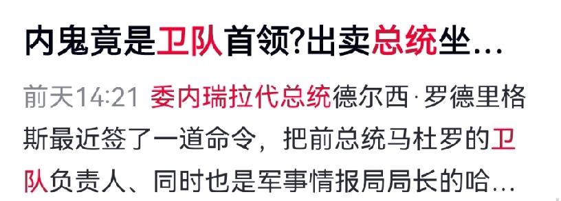 惊天背叛!委内瑞拉总统卫队司令塔巴塔将军竟被美国5000万美元赏金收买,亲手将总统马杜罗送入敌手。 作为反情报负责人,他泄露行踪、关闭防空系统,导致美军突袭得逞,马杜罗夫妇被捕,数十名保镖与军民丧生。 代总统罗德里格斯火速出手,派出特种部队将内鬼塔巴塔秘密抓获,随即全面调整安保人事,重整防御体系。目前,马杜罗仍被美方控制,罗德里格斯内外兼顾:既要稳定国内大局,又需与美国周旋谈判。 国际社会高度关注此次剧变。委内瑞拉前路虽艰,但举国团结一心,必能挺过危机,守护主权与尊严。 对此你怎么看?