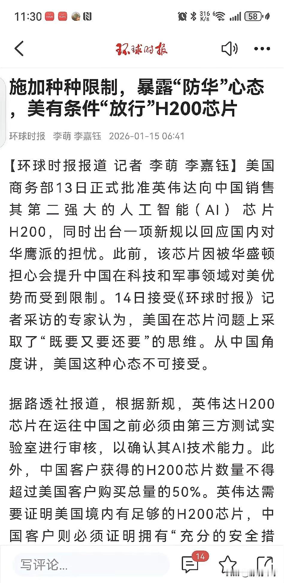 【H200大规模进入中国的可能性基本没有】 ​美国政府批准H200向中国出口,中国一些媒体也想营造我们要买H200芯片。 这事挺有意思的。美国那边说可以卖H200芯片了,但咱们这边海关据说没放行。两边这么一弄,就有看头了。 美国这个“批准”,后面跟着一堆条件。芯片得先送到他们指定的实验室去检查,看是不是和说好的一样。卖给咱们的数量,还不能超过卖给美国自己人的一半。这规矩定得,买卖做得真不痛快。 更关键的是那个“芯片税”。每卖一块芯片到中国,他们就要从里头抽走25%的钱。说是为了“国家安全”,其实就是硬生生切走一大块利润。这生意怎么做? 再看看咱们这边,反应挺平静的。有消息说,上面跟国内科技公司打了招呼,除非实在没办法,不然别买这些H200芯片。这意思已经很明白了。 为啥不买?原因可能有好几层。咱们自己的芯片企业,像华为昇腾这些,正在努力赶上来。这时候大量买别人的高端货,不就是给自家孩子泼冷水吗? 安全也是个大事。之前那个特供中国的H20芯片,不就被人扒出可能有安全漏洞和后门吗?用这样的芯片,就像在自家房子里给别人留了把钥匙,谁能放心? 这也许还是一种态度。在全球科技这盘棋上,有时候不买也是一种说话的方式。手里攥着钱不花,对方可能更着急。 国内企业搞AI研发,确实需要好芯片,但需要不等于随便买。听说现在只有像大学搞合作研究这种特殊情况,才会考虑放行。这说明咱们更想要一条自己能把握的路。 英伟达的老总黄仁勋自己也摸不准。他说中国市场太大不能放弃,但又觉得咱们不一定愿意买这种带着“枷锁”的芯片。换位想想,谁愿意花大价钱买个被拴着链子、还可能被人看着的东西? 这件事给所有中国企业提了个醒:最核心的东西,指望别人是靠不住的。华为被制裁后的经历就是活生生的例子,逼出了自己的系统和平合。自己研发的路走起来是累,但东西攥在自己手里,夜里睡得踏实。 芯片这事,早就不是简单的买卖了。它争的是以后智能时代,谁说了算。美国的“放行”捆着手脚,咱们的“冷静”心里有数。路还长,走着瞧。 各位读者你们怎么看?欢迎在评论区讨论。