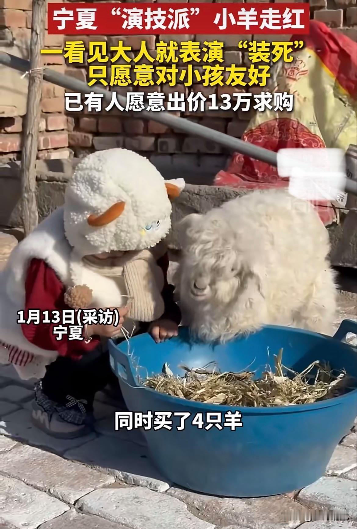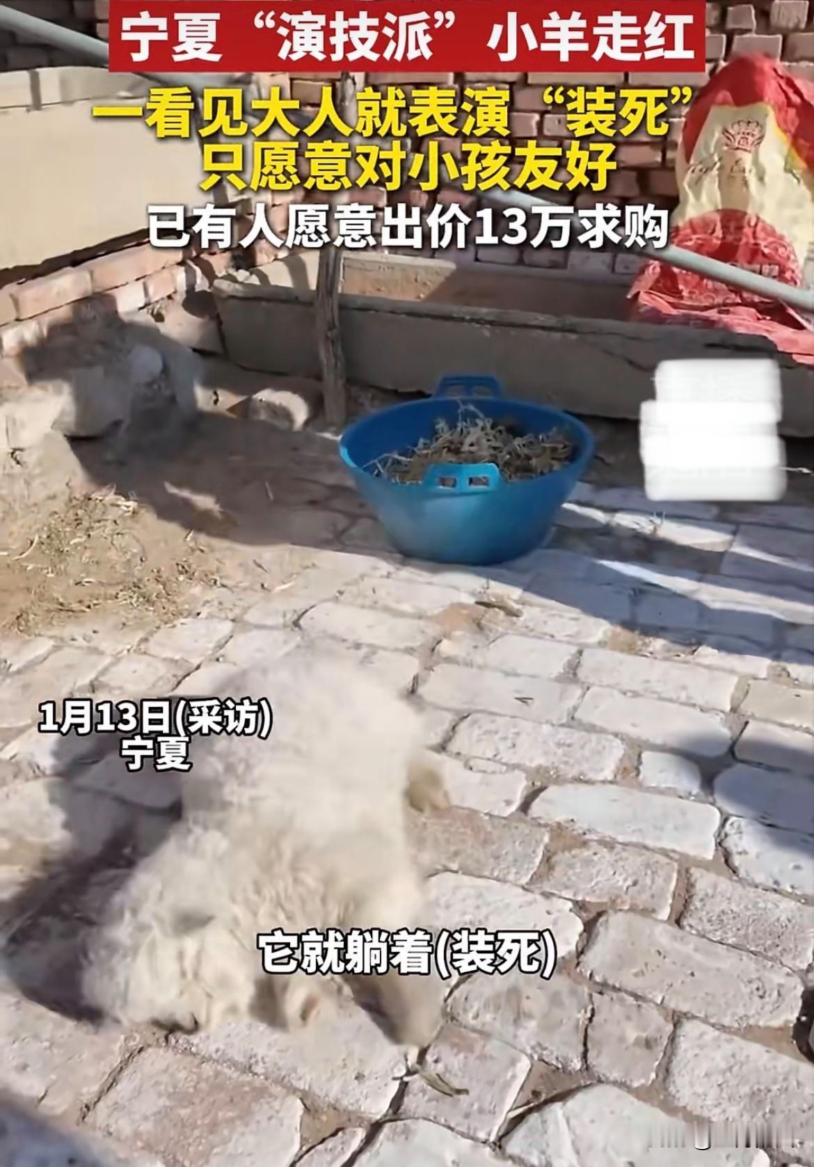 宁夏平罗县这只小羊羔,凭借逼真的演技火遍全网。 小羊碰到大人立刻就地“装死”,僵直倒地、屏息闭眼;瞧见小孩立马切换模式,摇尾蹭手温顺得不行,简直是看人下菜碟的行家。 这波反差萌直接让它火出天际,视频播放量破千万,身价从420元飙升到13万。养殖户精明得很,果断拒绝天价收购,要把它打造成家乡“代言羊”,成为打卡合影、带货特产的一条龙。