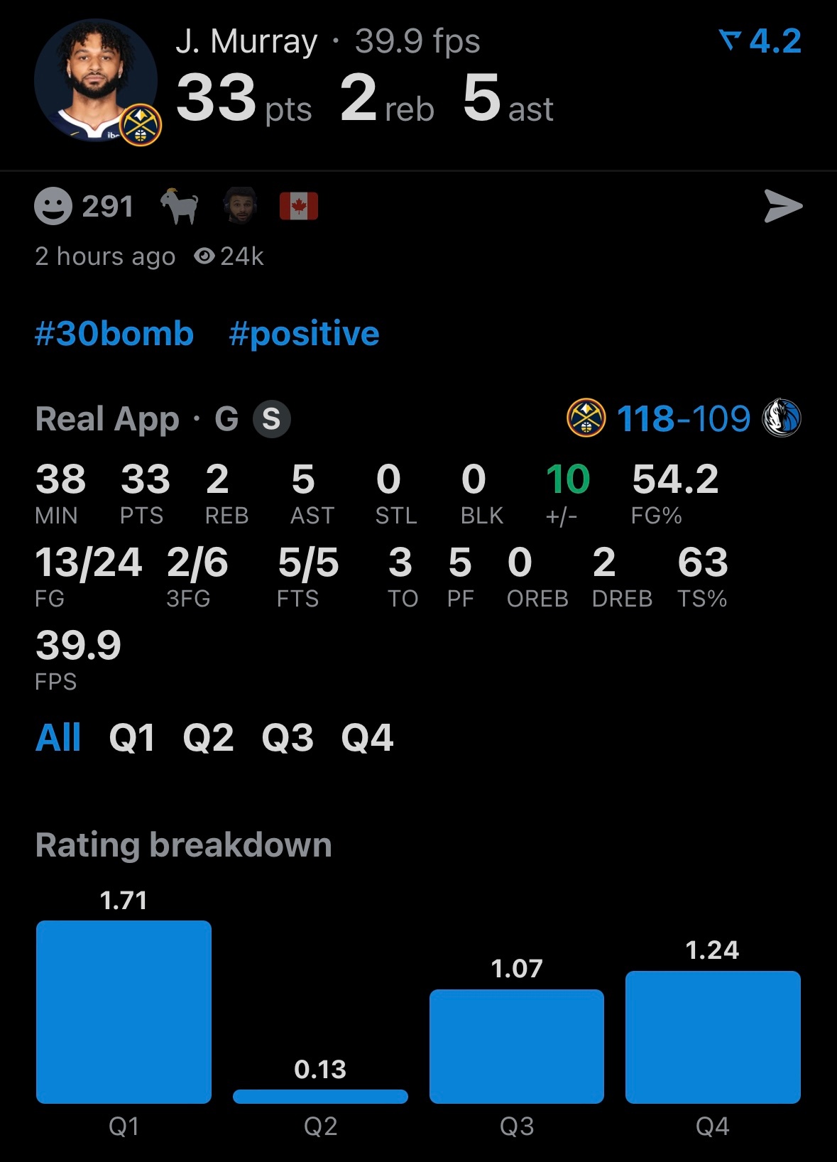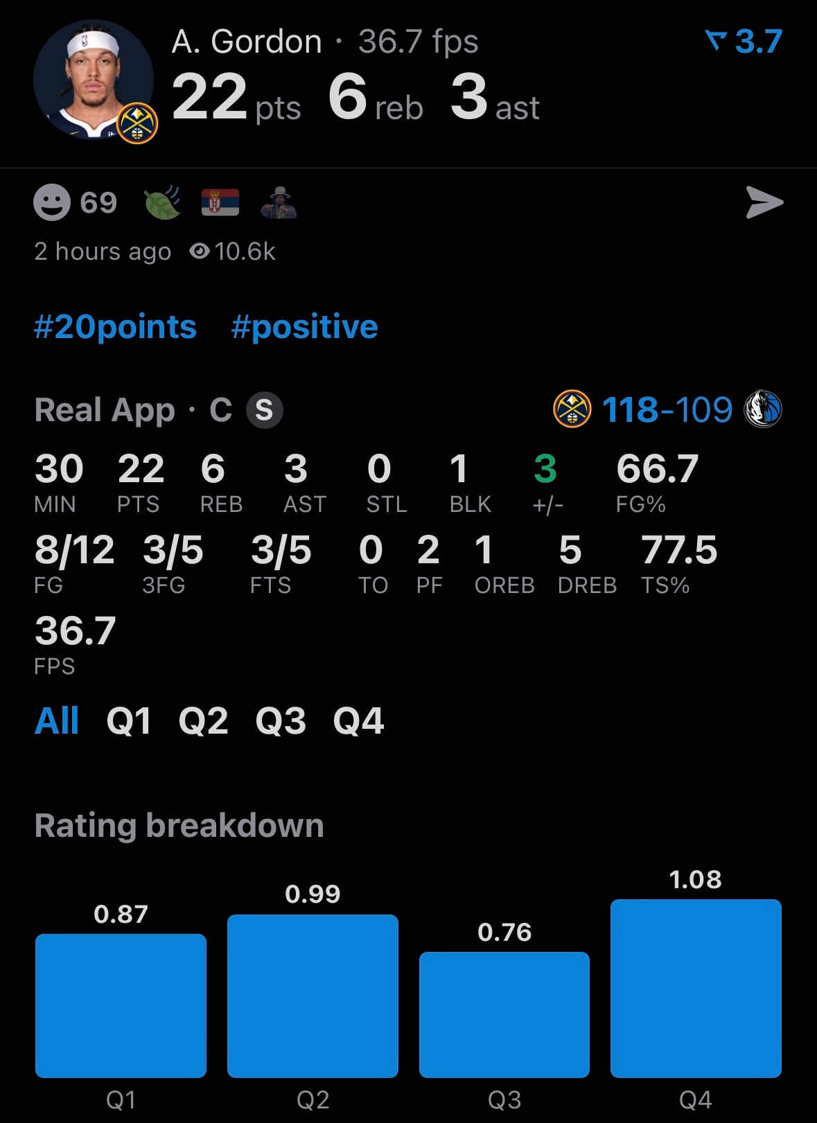又赢了,掘金三连胜,升至西部第二。穆雷33分2板5助攻。戈登22分6板3助攻,