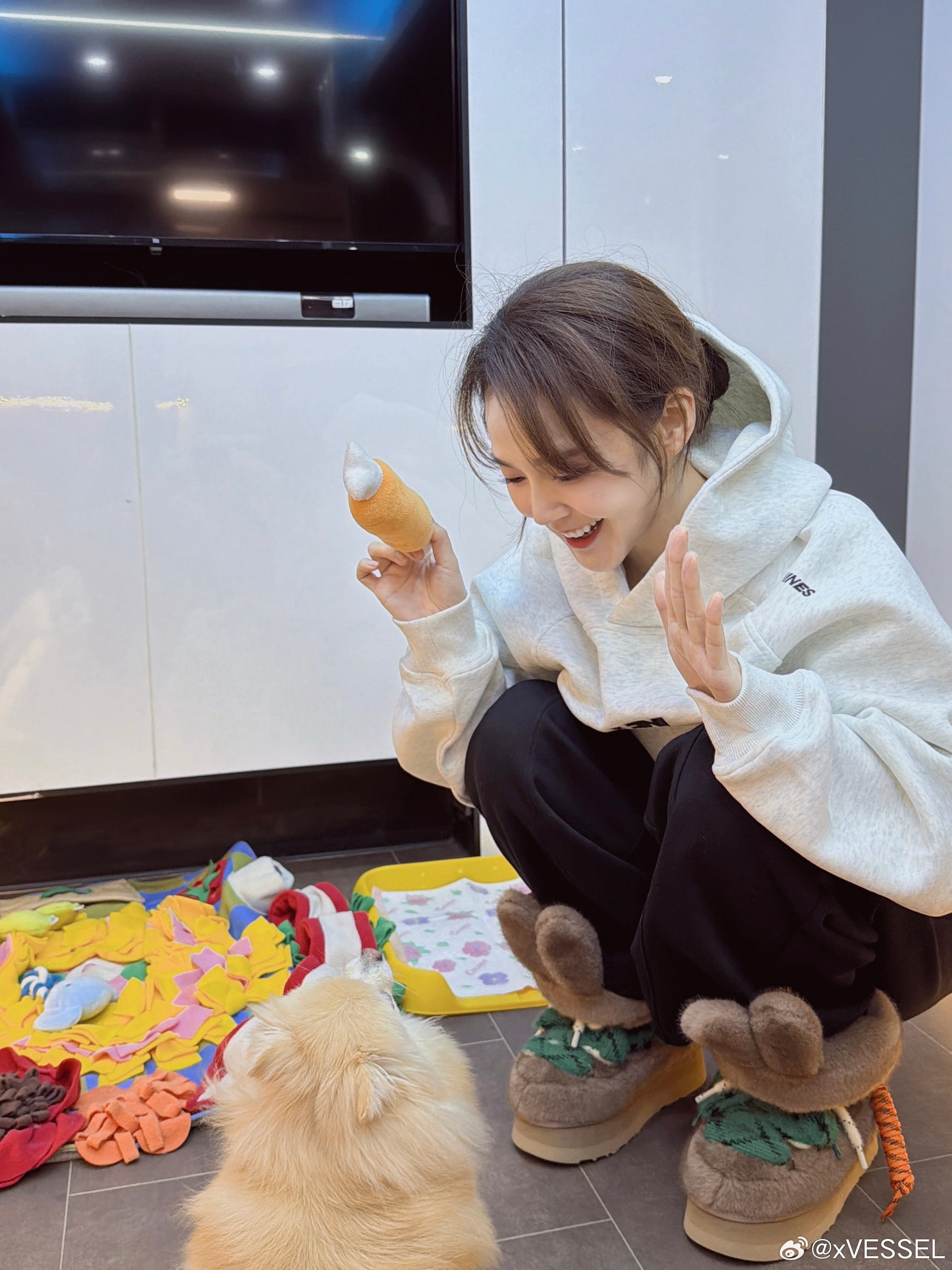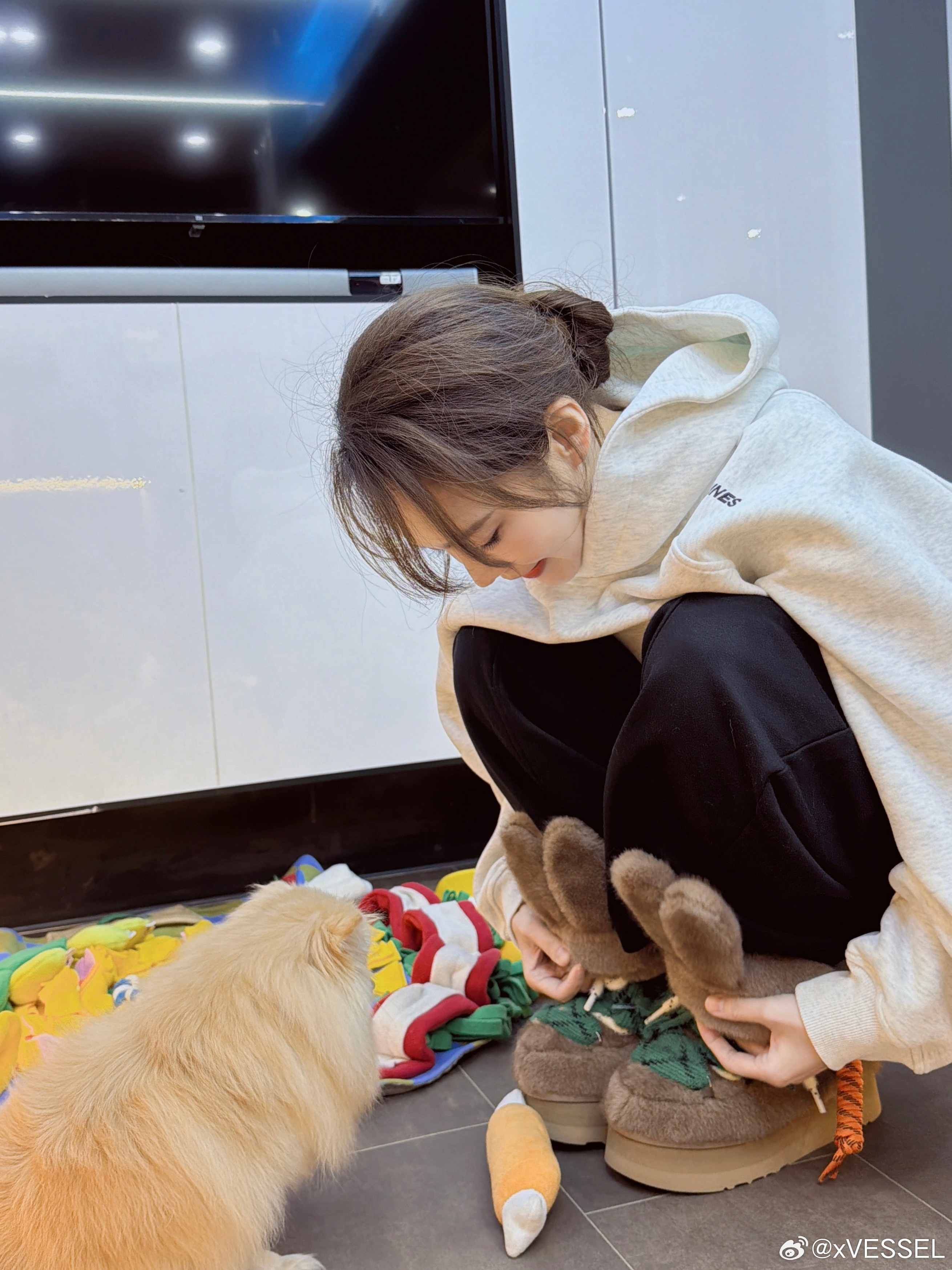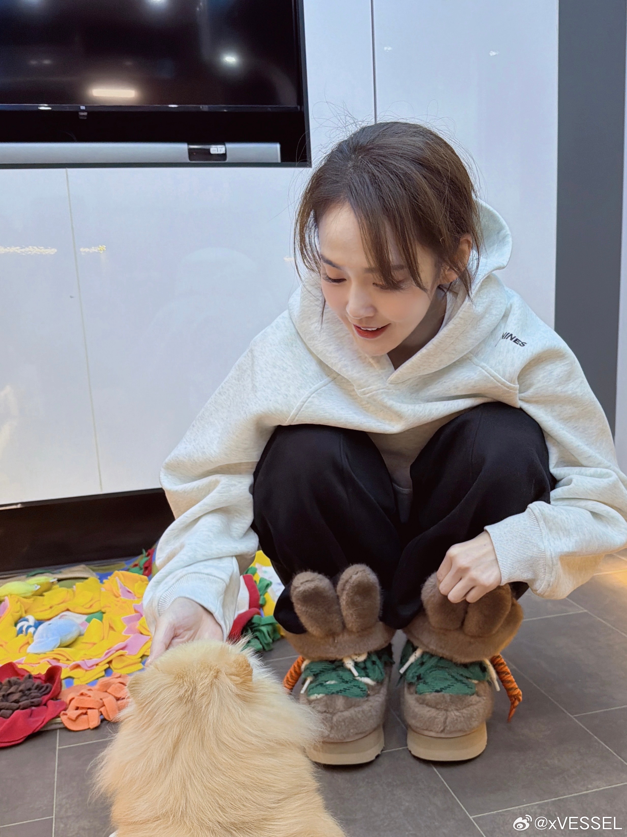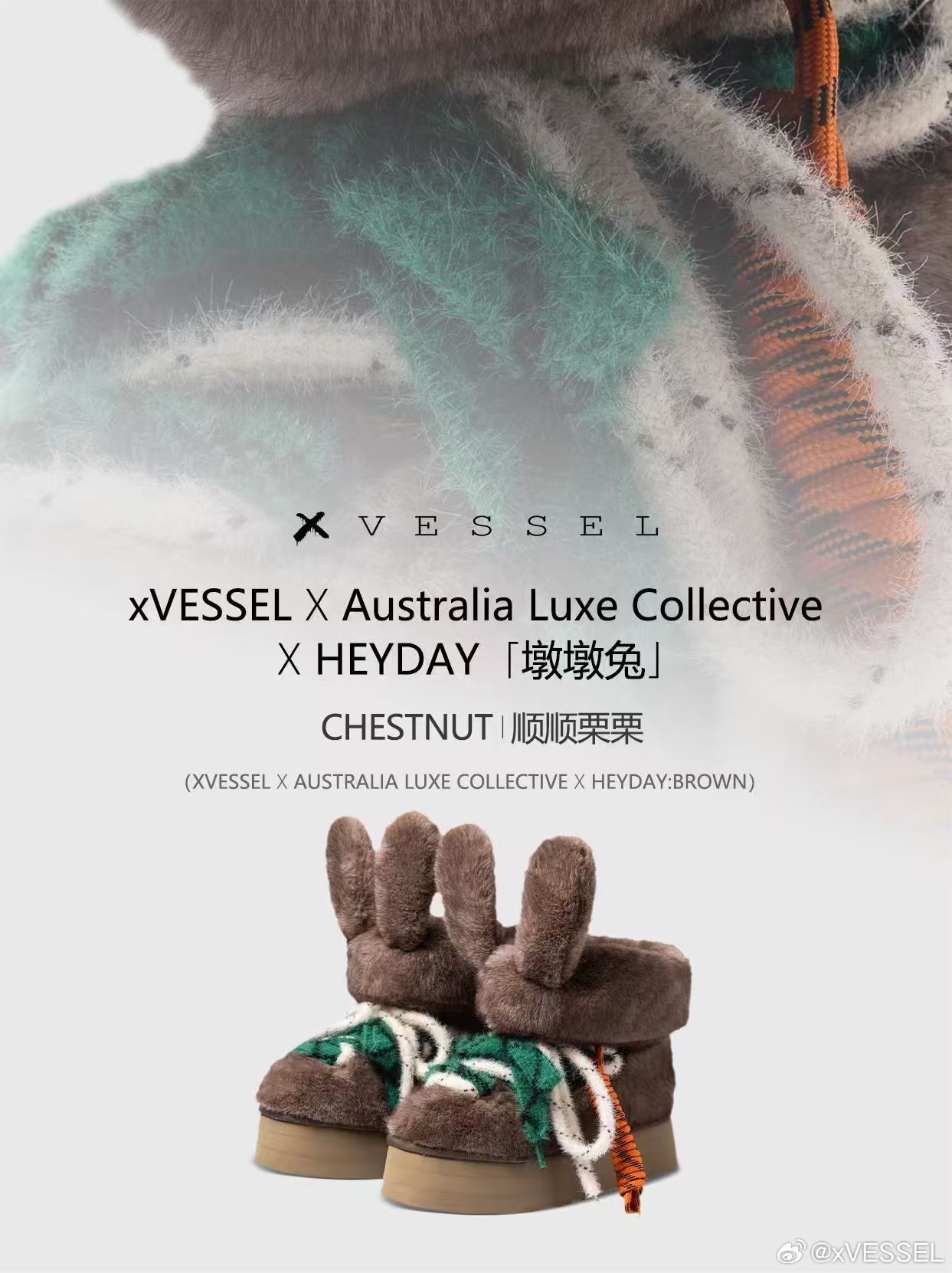 在po文中上脚【xVESSEL x Australia Luxe Collective x HEYDAY三方联名墩墩兔雪地靴】延续经典轮廓,以蓬绒栗色调包裹冬日步履可拆卸兔耳设计,在俏皮与飒气之间轻松转换张佳宁的快乐冬天❄️软fufu的鞋+粘人的修勾 幸福感拉满💕张佳宁