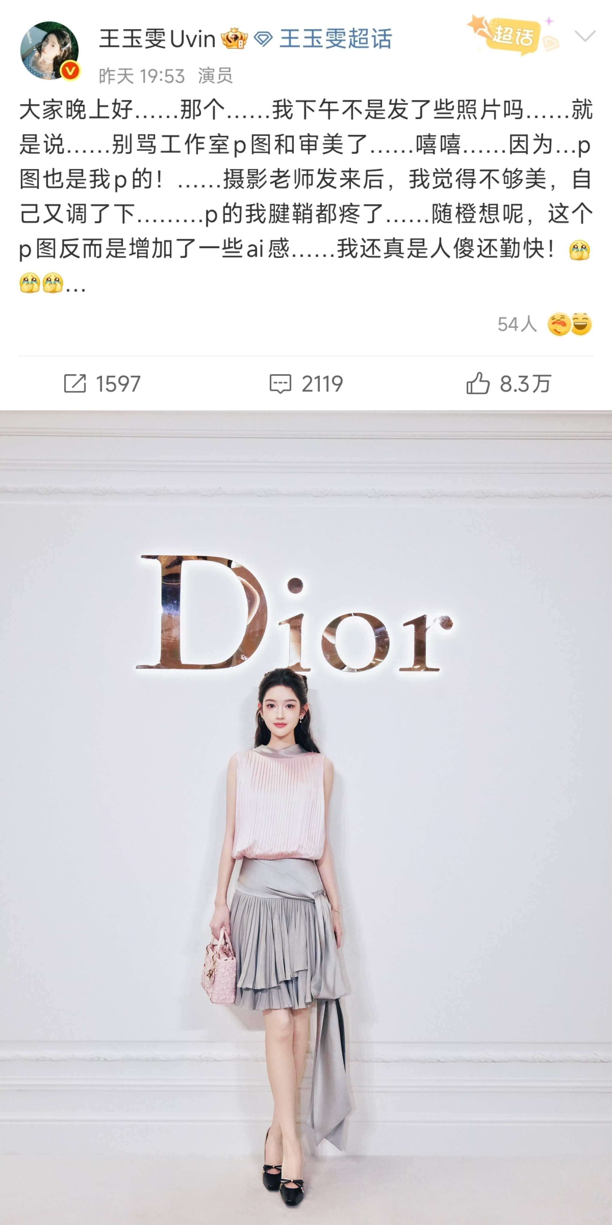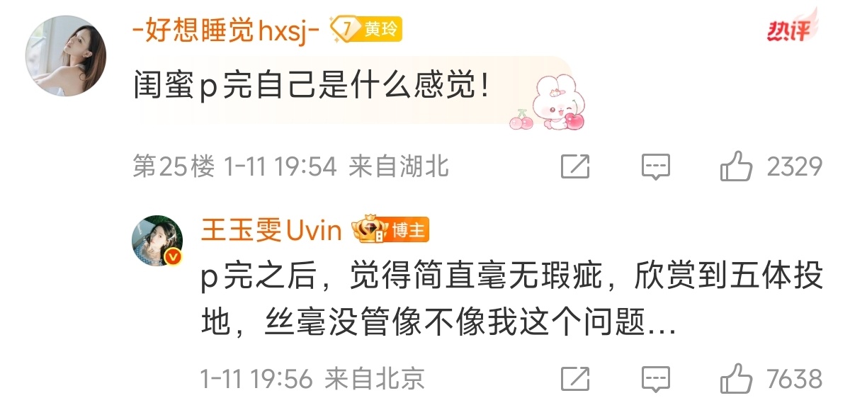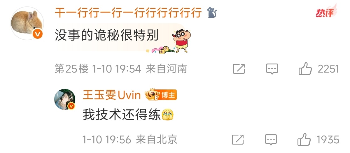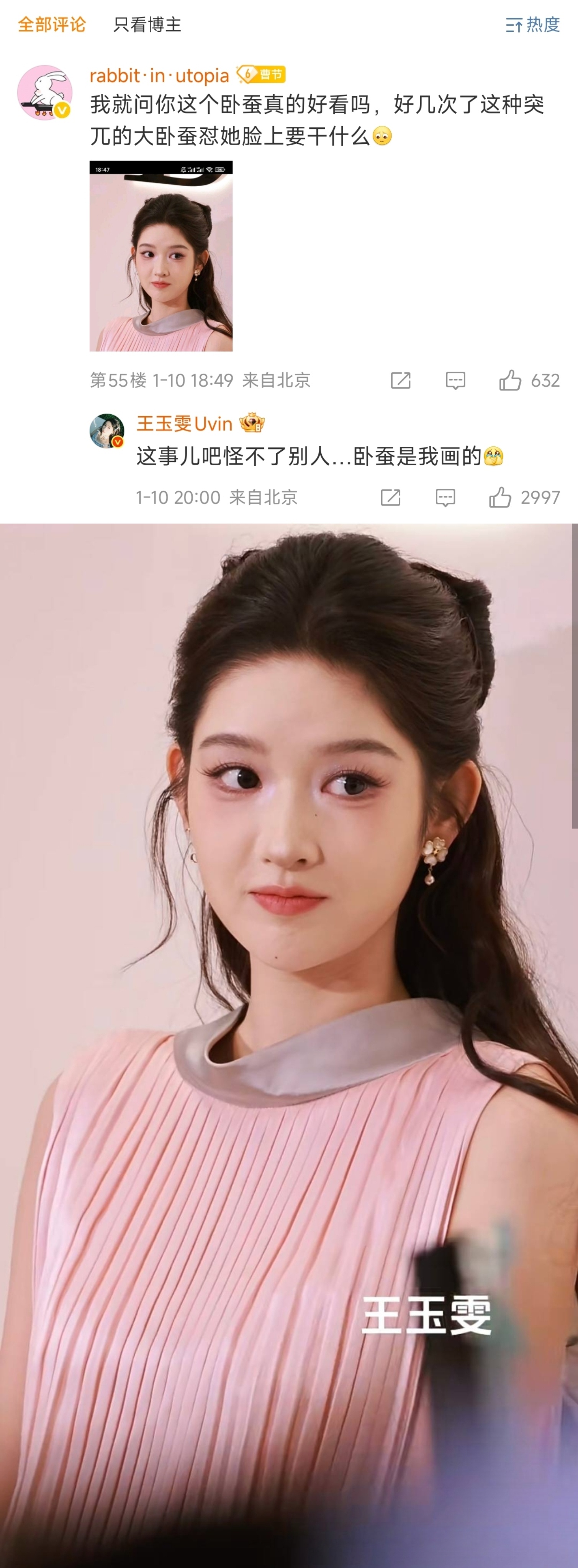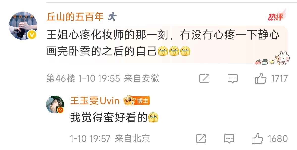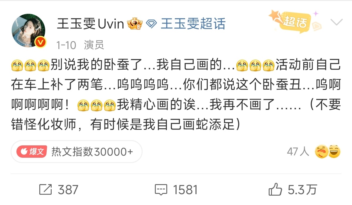 这个王玉雯真的好可爱 王玉雯专门发了两条微博澄清卧蚕是自己画的、图是自己P的,让粉丝不要错怪化妆师、摄影师和工作室的样子太萌了!不甩锅,不玻璃心,不训粉,幽默自嘲,活人感满满的大美女真的好可爱啊剧综汇精彩微博演员影响力