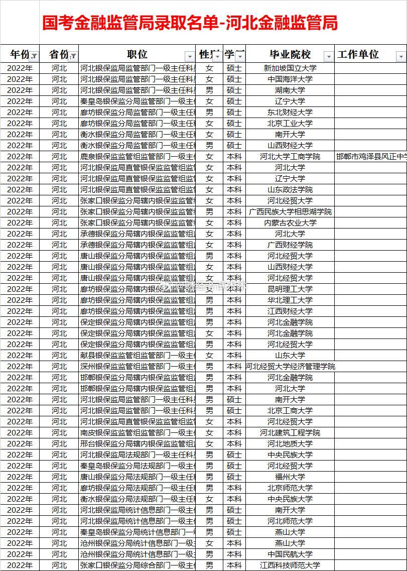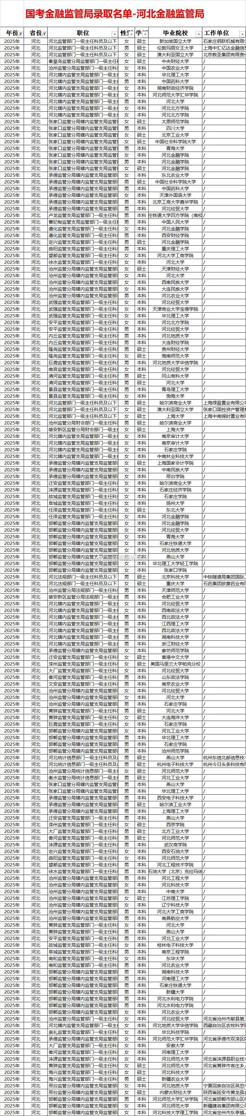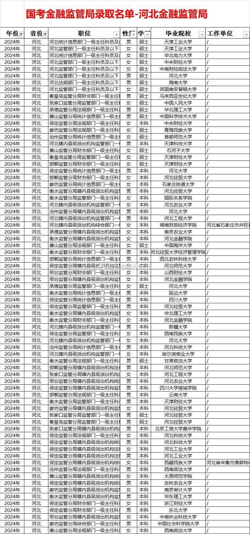 国考河北金管局录取名单面试入围分数线汇总一、录取基本情况2021-2025 年累计录取407 人,各年度人数及性别分布如下:2021 年 28 人(女 23 / 男 5)、2022 年 46 人(女 23 / 男 23)、2023 年 99 人(女 66 / 男 33)、2024 年 73 人(女 39 / 男 34)、2025 年 161 人(女 90 / 男 71)。女性累计 241 人,占比约 59.2%,占比明显偏高。二、录取高校层次生源院校层次多元,呈现 **“重点引领 + 本地支撑”** 特点:一是海外名校(新加坡国立大学、伦敦玛丽女王大学等),占比约 5%;二是国内顶尖财经、综合类院校(中央财经大学、中国人民大学等),为核心生源;三是河北本地院校(河北金融学院、河北经贸大学等),占比超三成,是主要生源地;四是区域双非本科院校,覆盖面广。三、工作单位情况录取人员中应届生占比超六成,无前置工作单位;往届生前置单位行业分布集中,主要分为两类:一是金融相关企业(如地方农商行、金融科技公司);二是基层行政机关及事业单位,少数来自制造业企业,职业背景与岗位匹配度较高。四、各岗位进面分数线区间段趋势财经岗:46.6-70.4,最高分居各岗位之首,近五年最高分小幅抬升,竞争持续激烈;财会岗:46.7-69.4,分数区间稳定,最低分无明显波动,竞争强度中等;法律岗:52.2-65.8,最低分高于其他岗位,门槛稳定,竞争压力适中;计算机岗:48.3-61.4,分差较小,各年份分数线无显著涨跌,竞争态势温和;综合岗:46.1-68.2,整体分数区间平稳,最高分未出现大幅波动。