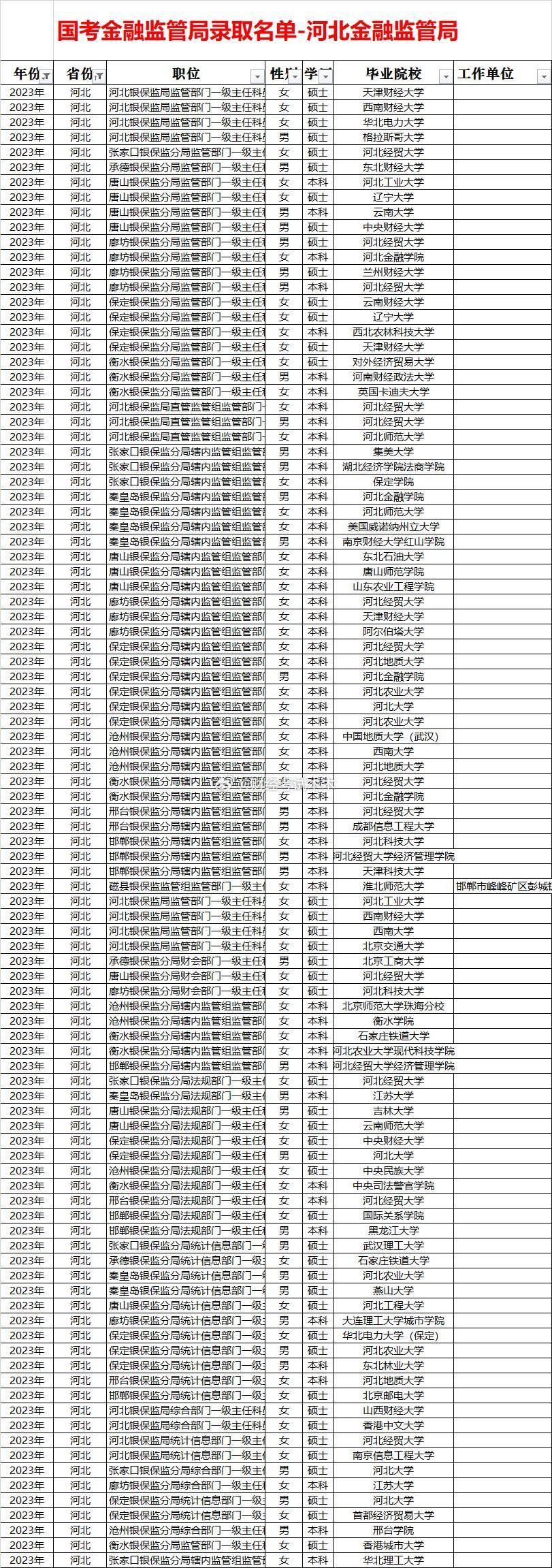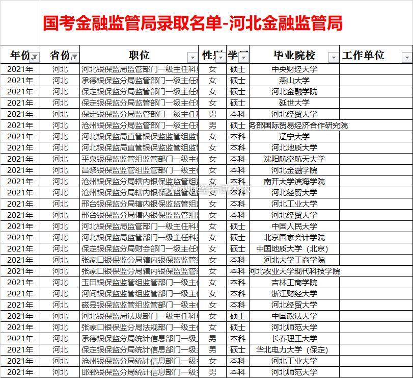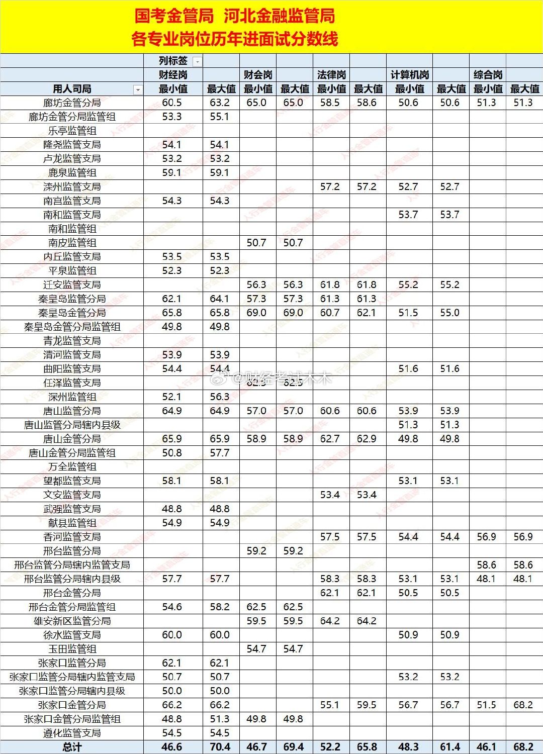 国考河北金管局录取名单面试入围分数线汇总一、录取基本情况2021-2025 年累计录取407 人,各年度人数及性别分布如下:2021 年 28 人(女 23 / 男 5)、2022 年 46 人(女 23 / 男 23)、2023 年 99 人(女 66 / 男 33)、2024 年 73 人(女 39 / 男 34)、2025 年 161 人(女 90 / 男 71)。女性累计 241 人,占比约 59.2%,占比明显偏高。二、录取高校层次生源院校层次多元,呈现 **“重点引领 + 本地支撑”** 特点:一是海外名校(新加坡国立大学、伦敦玛丽女王大学等),占比约 5%;二是国内顶尖财经、综合类院校(中央财经大学、中国人民大学等),为核心生源;三是河北本地院校(河北金融学院、河北经贸大学等),占比超三成,是主要生源地;四是区域双非本科院校,覆盖面广。三、工作单位情况录取人员中应届生占比超六成,无前置工作单位;往届生前置单位行业分布集中,主要分为两类:一是金融相关企业(如地方农商行、金融科技公司);二是基层行政机关及事业单位,少数来自制造业企业,职业背景与岗位匹配度较高。四、各岗位进面分数线区间段趋势财经岗:46.6-70.4,最高分居各岗位之首,近五年最高分小幅抬升,竞争持续激烈;财会岗:46.7-69.4,分数区间稳定,最低分无明显波动,竞争强度中等;法律岗:52.2-65.8,最低分高于其他岗位,门槛稳定,竞争压力适中;计算机岗:48.3-61.4,分差较小,各年份分数线无显著涨跌,竞争态势温和;综合岗:46.1-68.2,整体分数区间平稳,最高分未出现大幅波动。
