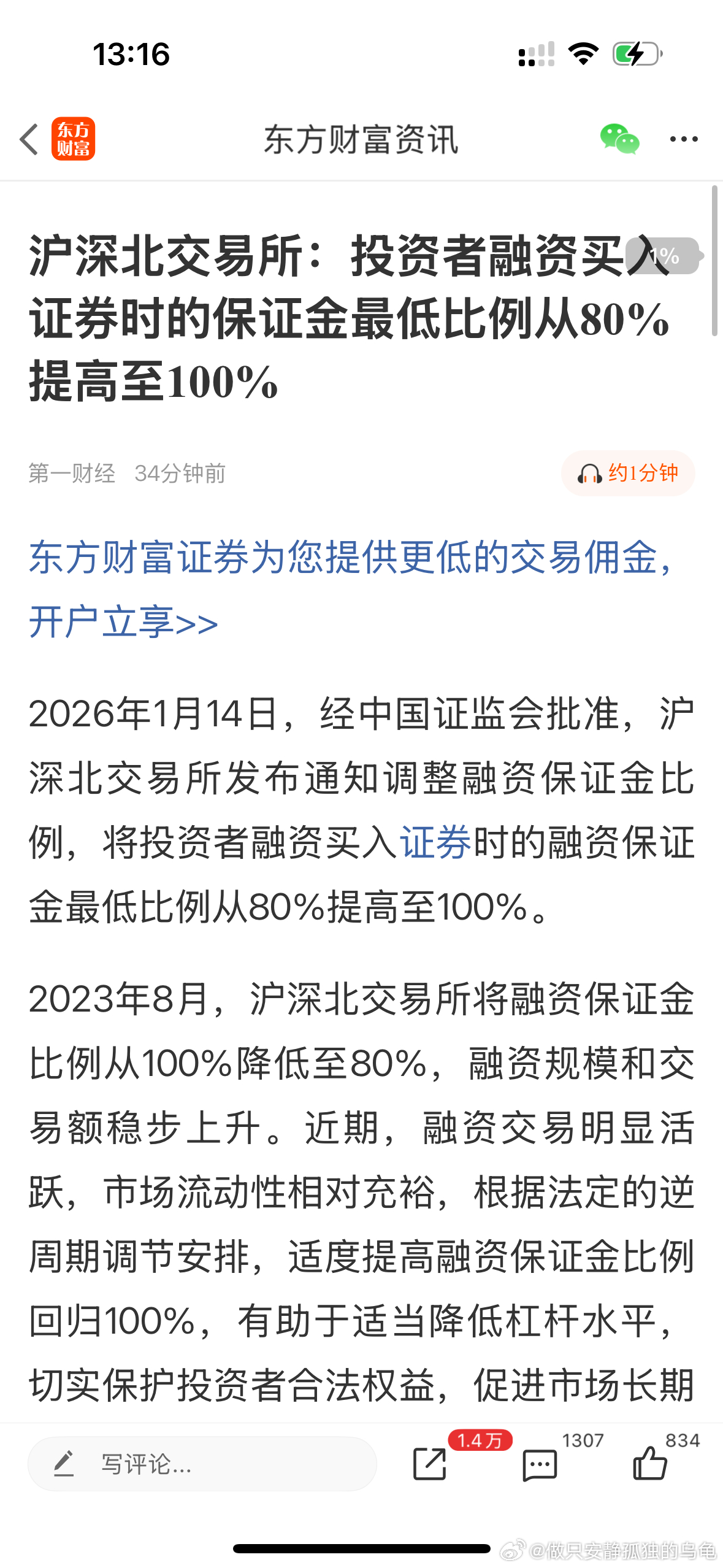 2023年8月,沪深北交易所将融资保证金比例从100%降低至80%。2026年1月14日沪深北交易所,投资者融资买入证券时的保证金最低比例从80%提高至100%。可以让你上天,同样也可以让你入地。慢牛可以,但是你们太狂了,鞭策一下,小登休息,老登能否扛起来,姜还是老的辣。