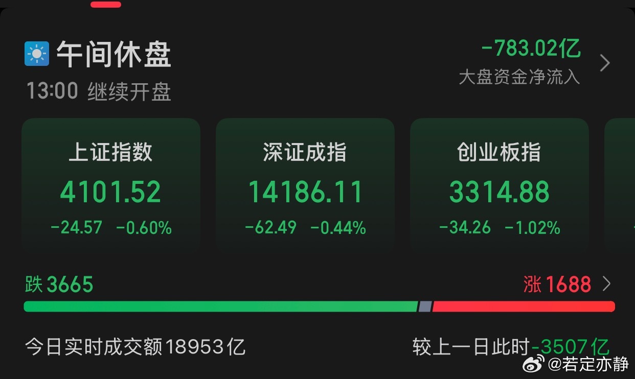 1.15午评:截至午盘,上证指数跌0.6%,报收4101.52点,深证成指跌0.44%,创业板指跌1.02%,北证50跌2.31%。全市场成交额18952亿元,较上日成交额缩量3506亿元。➡️板块题材上,贵金属、能源金属、农化产品板块活跃,商业航天、ai应用板块调整。➡️盘面上,贵金属板块持续走强,四川黄金涨停,湖南白银、晓程科技涨近6%。能源金属板块走高,华友钴业、远航精密涨超6%。农化产品板块早盘走强,东方铁塔涨超8%,百傲化学、联化科技涨超7%。商业航天板块调整,中科星图、天润科技、红相股份等多只个股跌超10%。雷科防务、长江通信、航天电子等数只个股跌停。ai应用板块调整,天龙集团、值得买、泓博医药20CM跌停,通达海、广哈通信等数只个股跌超10%。A股