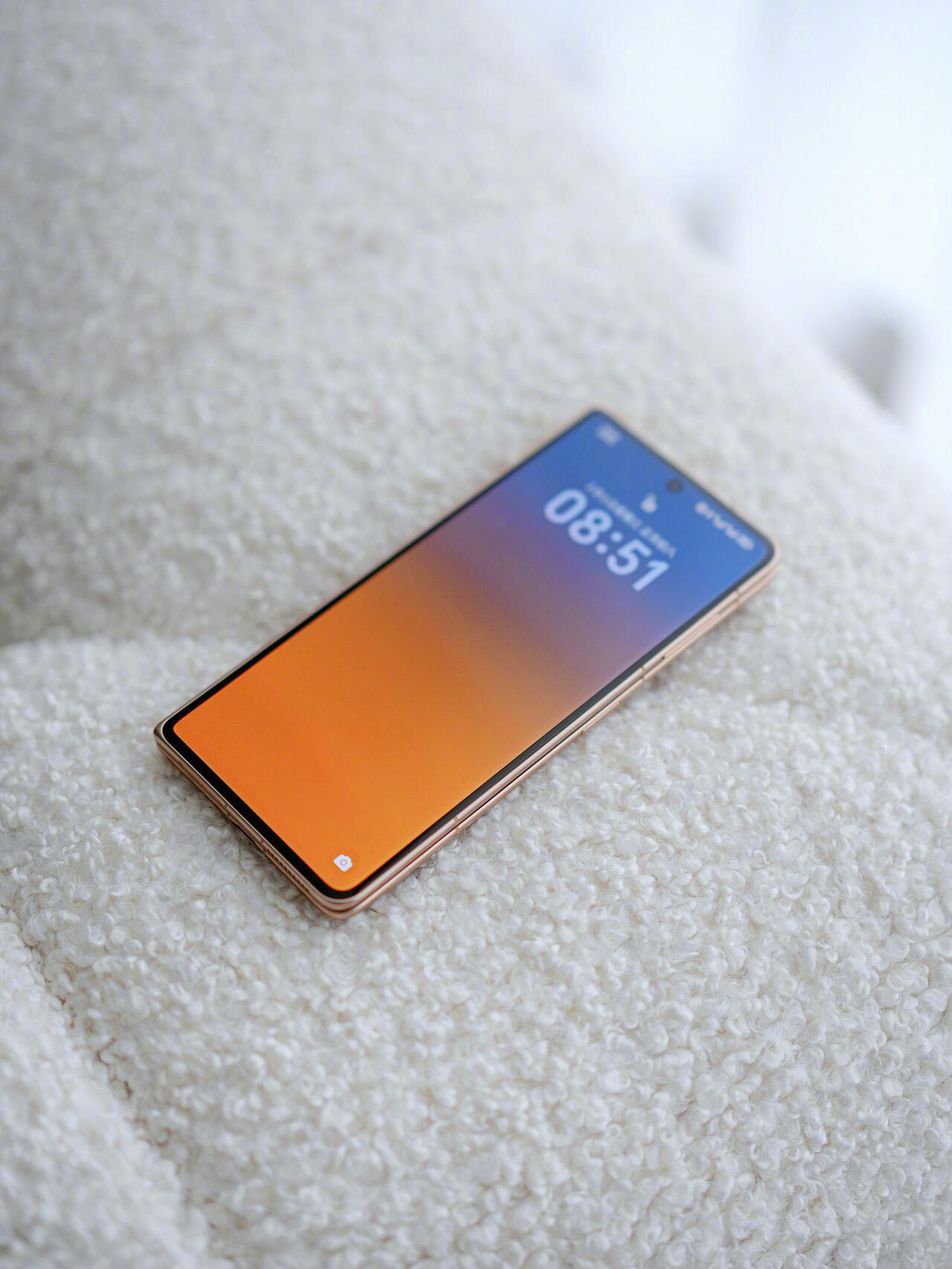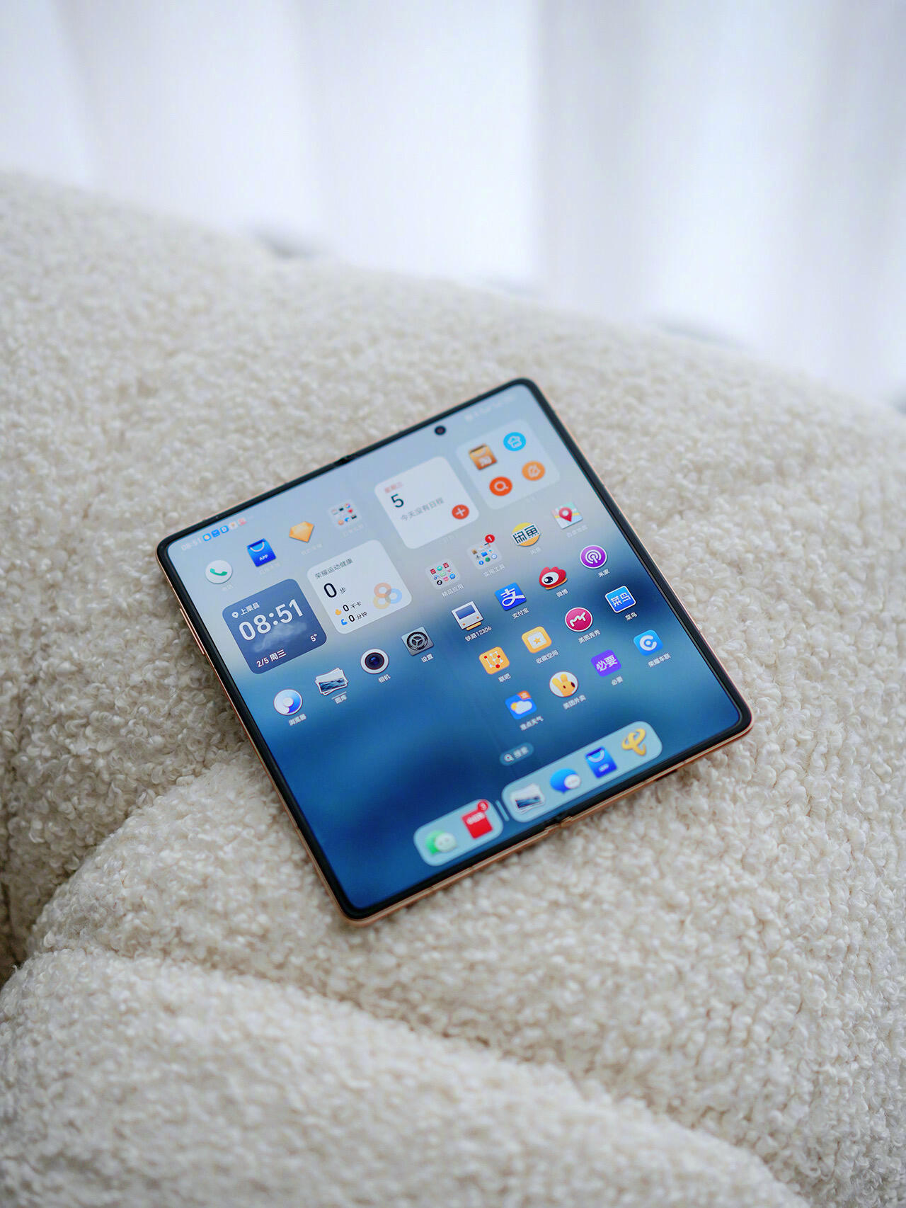 它是真的薄啊手感真的很好有一种 边缘圆润的手感而且还更薄敦煌色搭配金色真的很耐看就是那种百看不厌的感觉而且背面手感也很赞它真的是我的理想中的完美折叠手机