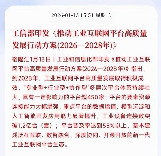刚刚收盘,人工智能板块迎来了政策性利好村里印发了一个行动方案,到2028年,有影响力的工业互联网平台要超450家,这些平台要能连更多工业设备,总数突破1.2亿台(套)。想想这是一个多大的规模,总数量1.2亿台,这是要以万亿价格来计算这次的行动方案了,服务器和AI相关的设备将会成为这次方案的主流。对投资者来说,这份方案是3年政策强催化+业绩高确定性的投资主线,核心价值是明确了赛道扩容、需求放量的量化目标。其中很多企业迎来真正的爆发企,尤其是其中的服务器企业将会实现业绩的再一次跨越。