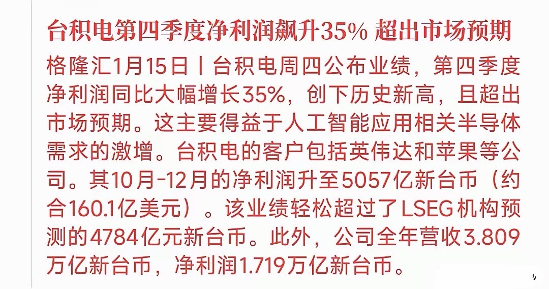 半导体盘中利好发布,板块直线拉升今天台积电发布了四季度业绩,净利润飙升35%,这是非常炸裂的业绩。第四季度净利润5,057亿元台币,预估4,670亿元台币。完全超出了市场的预期。消息发出后,半导体板块直接从下跌1%拉升到了上涨1%。存储芯片更是大涨。虽然半导体板块拉升,但是大盘指数并没有什么变化,主要就是大资金压盘大蓝筹和权重个股,目前个股还是涨少跌多。从现在的表现看目前A股市场是降温了,成交量在飞速的下降,预计今天2.7万亿的成交量都有点难。