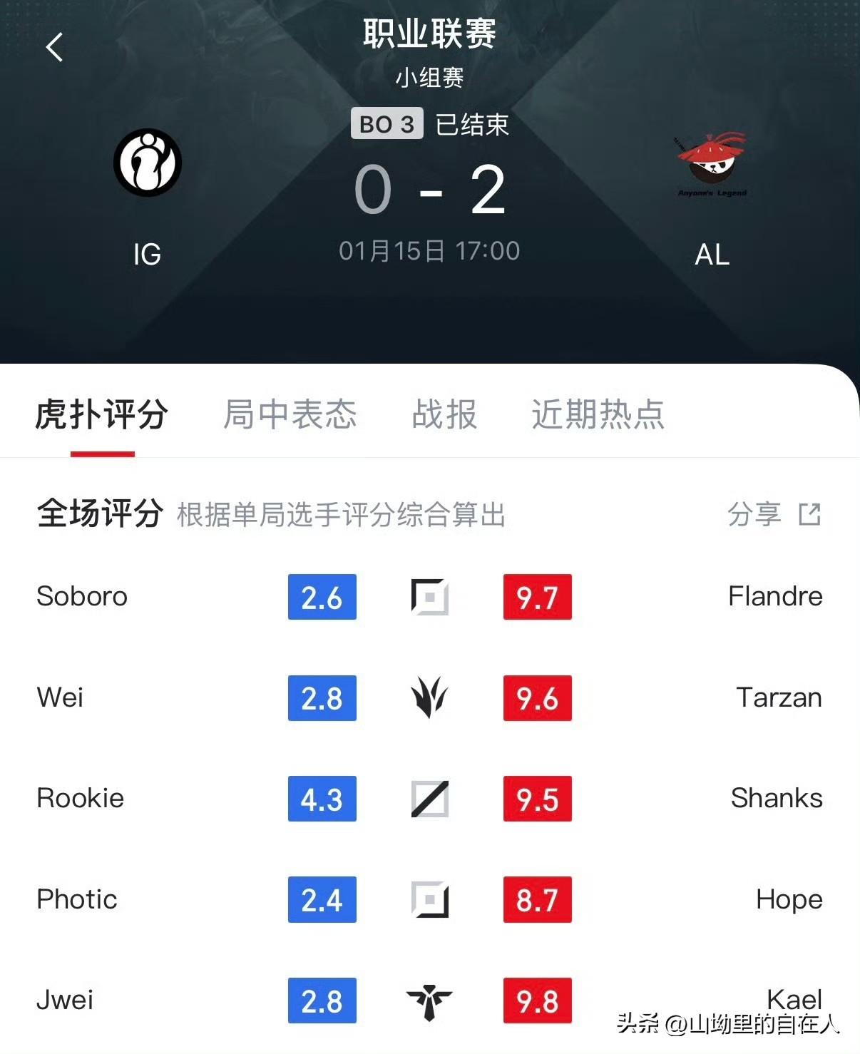 2026年1月15日LPL第一赛段,AL以2-0零封iG,拿下赛季首胜,iG遭遇两连败。 - AL:Flandre(雷克赛/塞恩)、Tarzan(皇子)、Shanks(沙皇/冰鸟)、Hope(韦鲁斯/飞机)、Kael(巴德) - iG:Soboro(鳄鱼)、Wei(狼母)、Rookie(发条/冰鸟)、Photic(希维尔)、Jwei(牛头) - 第一局(26分23秒):4分钟Flandre雷克赛单杀Soboro鳄鱼;22分钟Shanks沙皇闪现大招扭转战局,Hope韦鲁斯四杀;25分钟大龙团AL打出0换4,一波推平基地。 - 第二局(34分09秒):前期iG有优势,Soboro鳄鱼连续失误送节奏;21分钟河道团Soboro被瞬秒致IG溃败;25分钟AL拿下大龙与小龙,34分钟团灭IG结束比赛。 - 核心亮点:Hope韦鲁斯四杀、Shanks沙皇关键操作、Tarzan节奏带动,iG新人上单Soboro失误较多,Rookie难挽败局。