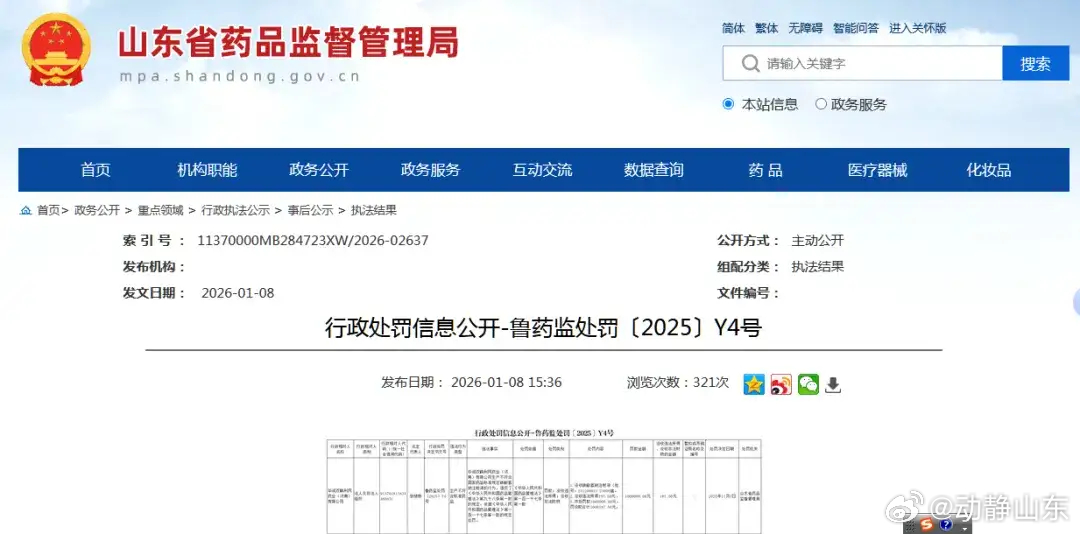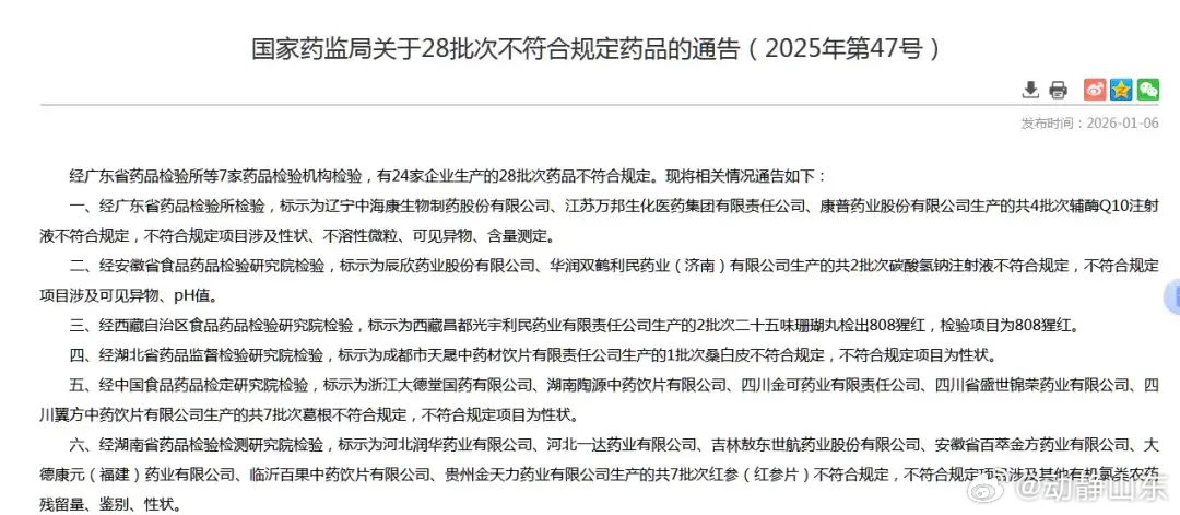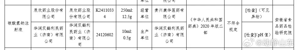 生产销售不合规药品,辰欣药业领312万罚单!因生产销售不符合规定药品,辰欣药业股份有限公司(下称“辰欣药业”,603367.SH)领到大额罚单。1月8日,山东省药品监督管理局公布的行政处罚信息公开-鲁药监处罚〔2025〕Y5号显示,辰欣药业生产销售不符合国家药品标准规定碳酸氢钠注射液的行为,违反了《中华人民共和国药品管理法》第九十八条第一款的规定。依据该法第一百一十七条第一款的规定,该局对其作出处罚:没收碳酸氢钠注射液(批号:K24110334)30464瓶、没收违法所得93318.20元、罚款3031700元,罚没款合计3125018.20元。相关决定于2025年11月4日生效。值得注意的是, 1月6日,国家药品监督管理局官网发布2025年第47号通告,公布28批次不符合规定药品情况,涉及24家企业,辰欣药业便是其中之一。通告明确要求相关企业立即暂停销售、召回并开展整改,同时依法对存在的涉嫌违法行为立案调查。经安徽省食品药品检验研究院检验,标示为辰欣药业生产的碳酸氢钠注射液(批号:K24110334)不符合规定,不符合规定项目为“可见异物”,相关检品来源于贵州康华医药有限公司。值得注意的是,针对国家药品监督管理局的通告和山东省药品监督管理局的行政处罚,辰欣药业近期并未对外公开披露该涉事信息。据了解,性状项下常记载外观、臭、味、溶解度以及物理常数等,在一定程度上反映药品的质量特性。可见异物系指存在于注射剂、眼用液体制剂中,在规定的目视条件下能够观察到的不溶性物质,其粒径或长度通常大于50微米。公开信息显示,碳酸氢钠注射液是一种酸碱平衡调节药物,主要适用于治疗代谢性酸中毒,碱化尿液,静脉滴注对某些药物中毒有非特异性的治疗作用。米内网数据显示,该品种2023年国内城市公立、县级公立、乡镇卫生三大终端市场销售额为6.6亿元,2024年上半年销售额为2.9亿元。辰欣药业官网显示,公司位于山东省济宁市,1970年成立,前身为济宁市第三制药厂,2011年更名为辰欣药业股份有限公司,2017年9月在上交所主板上市,是一家集研发、生产、销售于一体的大型综合性制药企业。产品涉及大容量注射剂、小容量注射剂、冻干粉针剂、片剂、胶囊、膏剂、滴剂、原料药等多种剂型400多个规格,涵盖基础输液、营养型输液、治疗型输液、肿瘤、抗菌抗病毒、呼吸系统、消化系统、神经系统、肝病、慢病等用药领域,销售网络遍布全国以及世界50多个国家和地区。来源:山东财经报道