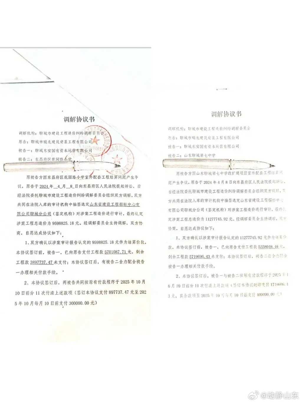 山东一企业主称承接学校工程被拖欠工程款,达成协议后每月还款又被“缩水”8年了,山东聊城的康瑞兆仍未要回被拖欠的数百万工程款。近日,康瑞兆向澎湃新闻反映称,2017年,他承接山东聊城两项学校的配套工程,项目完成后,数百万元的工程款一直被拖欠。之后,他想各种办法要钱,均无果。《关于新建东昌府区花园路小学项目可行性研究报告的批复》显示,东昌府区花园路小学项目总投资4377.99万元,资金来源全部由财政拨款解决。 本文图片均由受访者提供2024年,康瑞兆决定起诉。同年12月,康瑞兆的公司与工程的发包方聊城东安国有资本运营有限公司(以下简称“东安公司”)、山东聊城第七中学、东昌府区花园路小学签订两份《调解协议书》。康瑞兆表示,签订调解协议后,对方却没有按约履行。之后,他多次索要,仅要到20多万元及一套房产,共计值90多万元。2025年9月,他通过媒体曝光了此事,聊城市东昌府区教体局赵姓负责人与他达成口头协议,但2025年9月至今,东昌府区教体局、东安公司并未依据上述口头协议按时、足额还款,所承诺的按月还款方案“缩水”。康瑞兆称,他早已债务缠身,债主经常上门“逼债”,他希望东昌府区教体局、东安公司能考虑其实际困难,尽快归还被至今拖欠的800多万元。针对此事,2026年1月初,澎湃新闻致电东安公司相关负责人,对方回复称,已每月按时向康瑞兆还款7.5万元。对此,康瑞兆表示,之前,东安公司总是“这月还上月,拖一个月还款”。媒体联系东安公司后,对方当天就把12月所拖欠的部分补齐了。2026年1月6日,澎湃新闻联系东昌府区教体局赵姓负责人,对方称正在忙,后面会回复。之后,澎湃新闻多次拔打其电话,电话无人接听,短信没有回复。康瑞兆透露,之后赵姓负责人立即和他联系了,称会尽力协调此事。截至发稿前,双方未就还款问题达成一致。承接两项学校配套工程,被拖欠数百万工程款康瑞兆是山东聊城市人,此前从事建筑行业。2011年,他注册成立了聊城市瑞兆建筑安装工程有限公司(以下简称“瑞兆建筑安装公司”),并担任该公司法定代表人。康瑞兆称,2017年,他“借用”其他公司名义,承接了聊城市东昌府区花园路小学室外配套工程和山东聊城第七中学改扩建项目室外配套工程。2024年12月,双方曾就债务金额、还款计划达成调解协议。公开资料显示,东安公司是聊城市东昌府区的国有独资企业之一,主营业务为东昌府区授权范围内的资产管理和经营、基础设施投资等。康瑞兆表示,东昌府区花园路小学室外配套工程于2018年12月完工,聊城第七中学改扩建项目室外配套工程于2019年11月完工。在工程进行中,因发包方增加要求,临时变更了一些工程要求,最后导致工程审计迟迟没有通过,这也导致相关工程款一直被拖欠。长期催要工程款无果后,2024年,康瑞兆决定起诉维权。2024年12月,经调解,瑞兆建筑安装公司和东安公司、聊城七中、东昌府区花园路小学达成和解。瑞兆建筑安装公司和东安公司、聊城七中签订的《调解协议书》显示,双方确认以涉案审计报告认定的11277745.92元作为结算价款,本协议签订前,东安公司已向瑞兆建筑安装公司支付工程款5558049.49元,剩余工程款5719696.43未支付。本协议签订后,东安公司、聊城七中按原有付款程序于2025年10月10日前分11次付清上述款项(签订本协议时即支付1719696.43元,其余款项至2025年10月每月10日前支付400000.00元)。瑞兆建筑安装公司和东安公司、东昌府区花园路小学签订的《调解协议书》显示,双方确认以涉案审计报告认定的9598825.18元作为结算价款,本协议签订前,东安公司已向瑞兆建筑安装公司支付工程款5701087.71元,剩余工程款3897737.47未支付。本协议签订后,东安公司、东昌府区花园路小学共同按原有付款程序于2025年10月10日前分11次付清上述款项(签订本协议支付897737.47元,至2025年10月每月10日前支付300000.00元)。依据上述两份《调解协议书》,签订该调解协议时,东安公司拖欠康瑞兆共计960万余元,相关欠款于2025年10月前分期付清。但东安公司、涉事学校并未按照约定还款。工程款被拖欠,公司资金链断裂康瑞兆称,由于上述工程款被拖欠,公司经营不善,2024年,他的公司资金链断裂。为了归还工程垫资债务,他抵押了个人、父母、朋友等名下的9套房产,并借了大量网贷、高利贷,现已全部逾期。澎湃新闻查询发现,2021年,康瑞兆的瑞兆建筑安装公司被法院列为限制高消费企业。自2023年开始,该公司多次因欠税被列入欠税公告名单。康瑞兆的公司已被列为失信公司、限制高消费企业。康瑞兆介绍,自2024年年底开始,他多次到东昌府区教体局、东安公司沟通此事,经多次索要,2025年1月,春节前夕,东安公司支付了1.5万元。2025年春节后,东昌府区教体局支付了28.8万元,以及协调抵扣了一套房产62.9万元,累计向其支付价值90多万元。针对康瑞兆的反映,2025年4月,聊城市相关领导曾作出批示,“请东昌府区尽快拿出偿还方案,以解企业之困”。然而,问题一直没有解决。2025年9月,“康瑞兆被拖欠数百万工程款8年”一事被媒体曝光。康瑞兆表示,其后东昌府区教体局与其达成了口头协议,剩余的工程款分期偿还,由区教体局每月还款15万元。之后,该方案有所调整,即每月由区教体局、东安公司分别向其还款7.5万元。康瑞兆称,针对还款问题,他曾想签订书面协议,但区教体局、东安公司一直拒绝