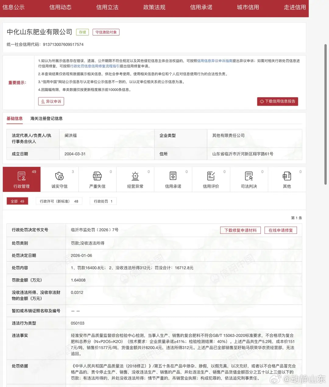 来源:中国食品报新媒体中化化肥控股子公司生产、销售不合格肥料被查处近日,从信用中国公布,中化山东肥业有限公司因生产、销售不合格复合肥料,被临沂市市场监督管理局处罚款16400.8元、没收违法所得312元。违法事实为:经淮安市产品质量监督综合检验中心检测,当事人生产、销售的复合肥料不符合GB/T 15063-2020标准要求,不合格项为复合肥料总养分(N+P2O5+K2O)(技术要求:企业质量承诺≥41%;检验检测结果:40%)。上述产品共生产5.2吨,成本价1517元/吨,销售价1577元/吨,货值金额共计8200.4元,违法所得312元。上述产品已全部销售至盱眙马坝荣华农资经营部,无法追回。企查查显示,中化山东肥业有限公司由中化化肥有限公司持股91%。中化化肥有限公司成立于1993年,于2005年7月,在香港联合交易所挂牌上市,股票代码为00297.HK 。2022年,中化化肥有限公司曾因销售肥料不合格被北京市丰台区市场监督管理局处罚。2021年,因以较大幅度加价销售氯化钾,平均销售价格上涨幅度达58.37%。存在哄抬价格行为,被国家市场监督管理总局处260万元罚款。