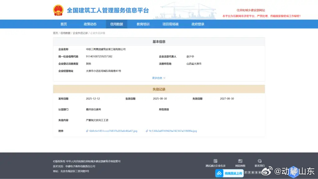 严重拖欠农民工工资!中铁三局集团建筑安装工程有限公司被住建部列入失信记录记者从全国建筑工人管理服务信息平台获悉,中铁三局集团建筑安装工程有限公司因严重拖欠农民工工资问题,被嘉祥县住建局认定,并被住建部列入失信记录。根据行政处罚决定书显示,中铁三局集团建筑安装工程有限公司地址位于太原市小店区,坞城东街南巷,法定代表人周发恒。该企业在嘉祥君悦苑小区项目施工过程中,未实行劳动用工实名制管理,并且有《调查(询问)笔录》、照片等证据佐证。依据相关规定,嘉祥县住建局拟对中铁三局集团建筑安装工程有限公司作出以下行政处罚:1、责令停工;2、罚款人民币拾万元(100000)。来源半岛都市报