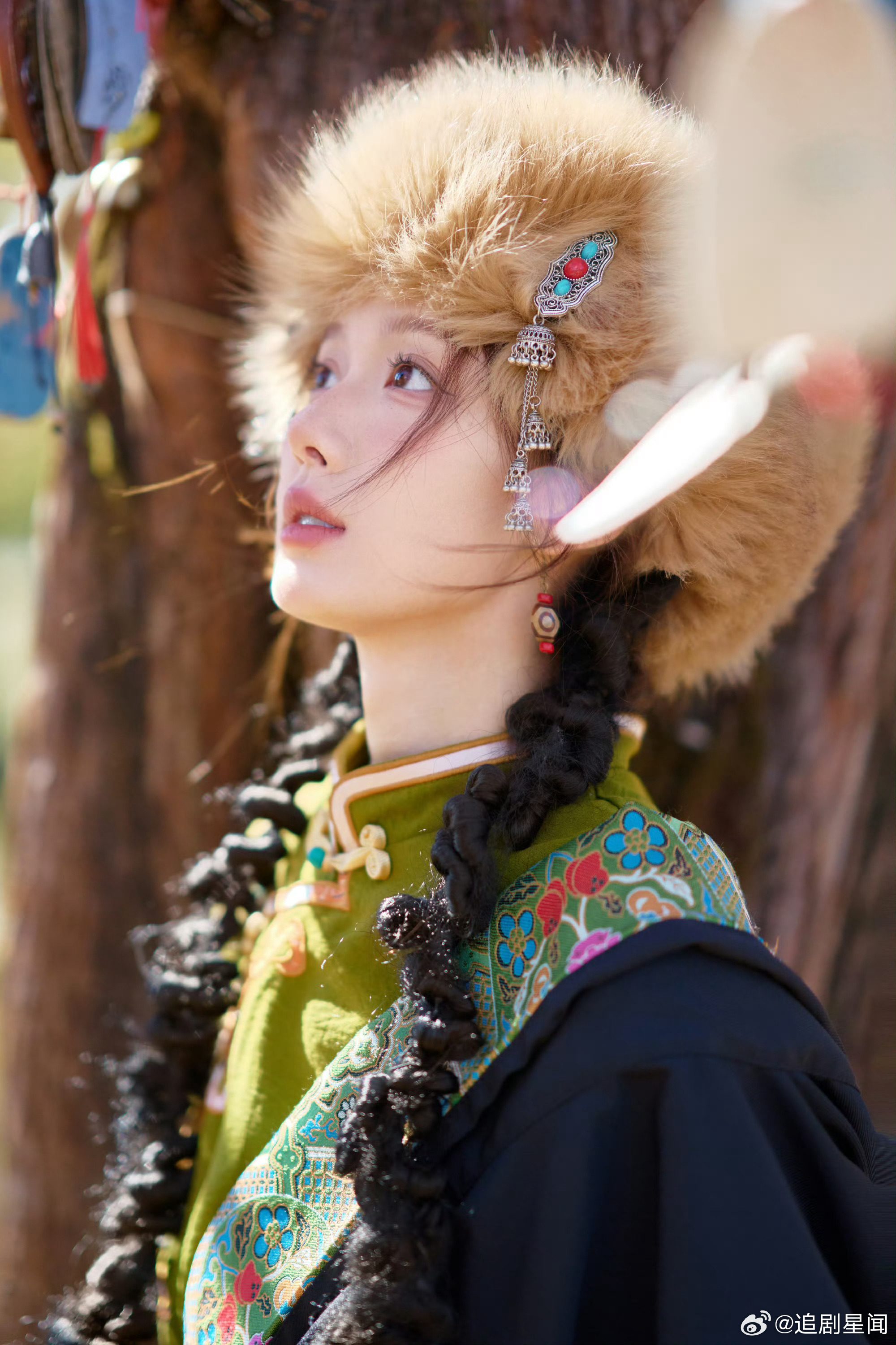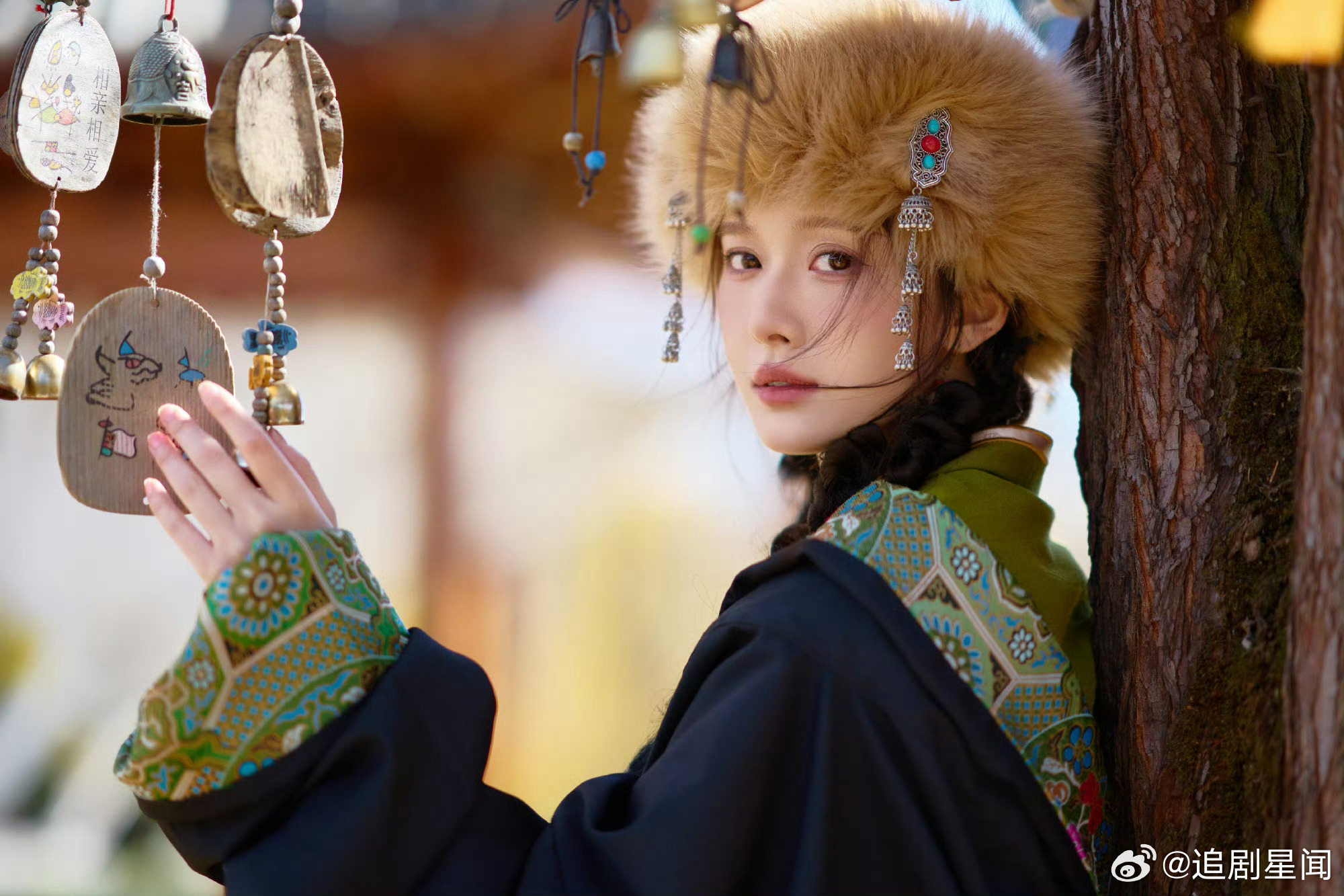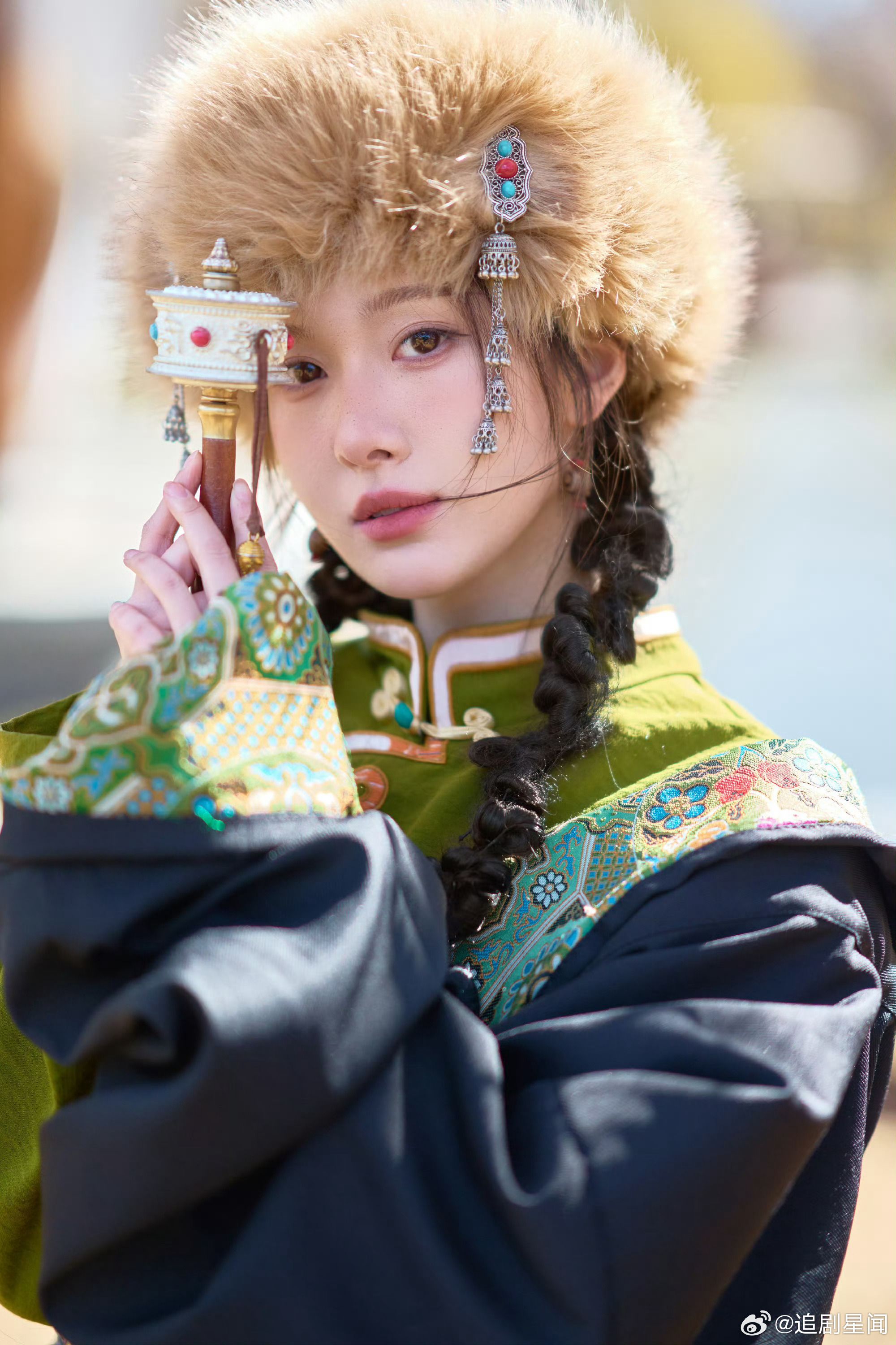 王子璇解锁藏风新造型,毛绒帽搭配刺绣服饰,手持转经筒的画面,既有民族韵味又有独特美感。王子璇