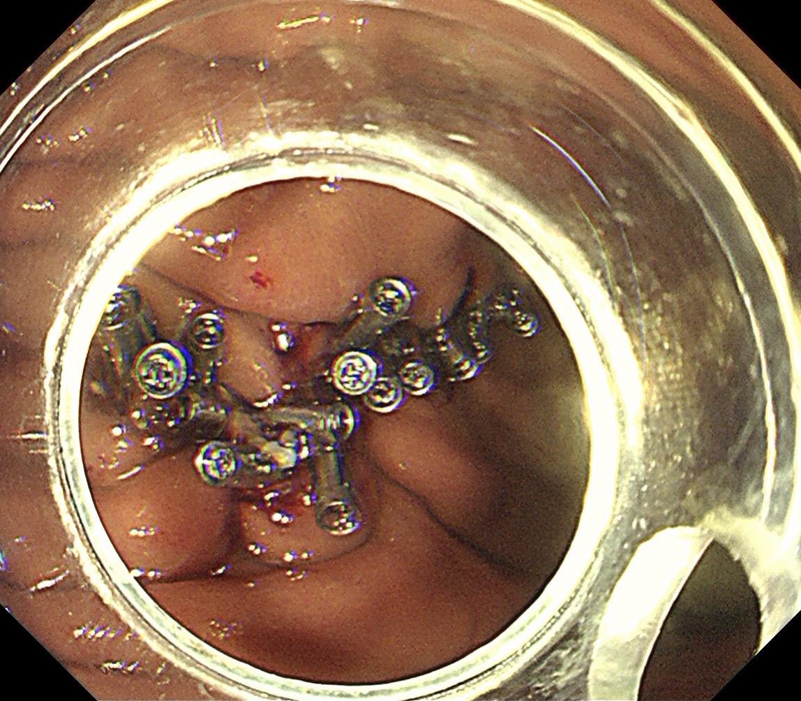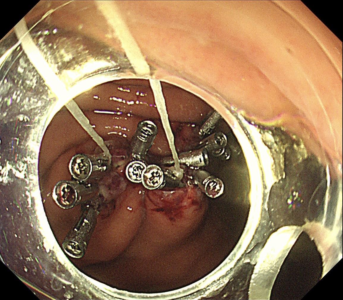 双牙线牵引辅助缝合,我们科大二附院内镜中心的小创意! 胃体上部大弯侧近3厘米的瘤子,疑难位置,不管是这正镜还是倒镜都很难靠近,钛夹也打不牢。我们灵机一动在创面两侧各打一个牙线牵引,使创面变小、也有支撑,这样缝合变的简单牢固!不仅给患者节省了费用,也保证了手术安全。内镜医生有时候的小巧思能解决大问题!
