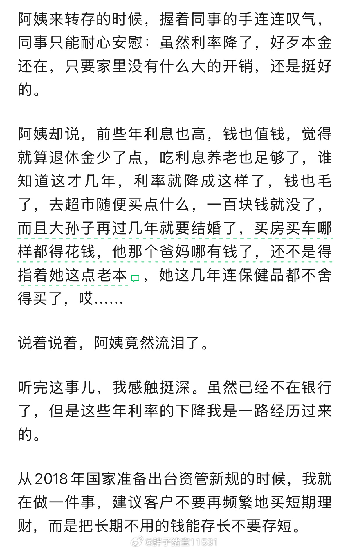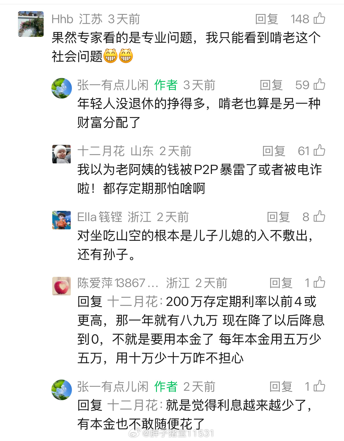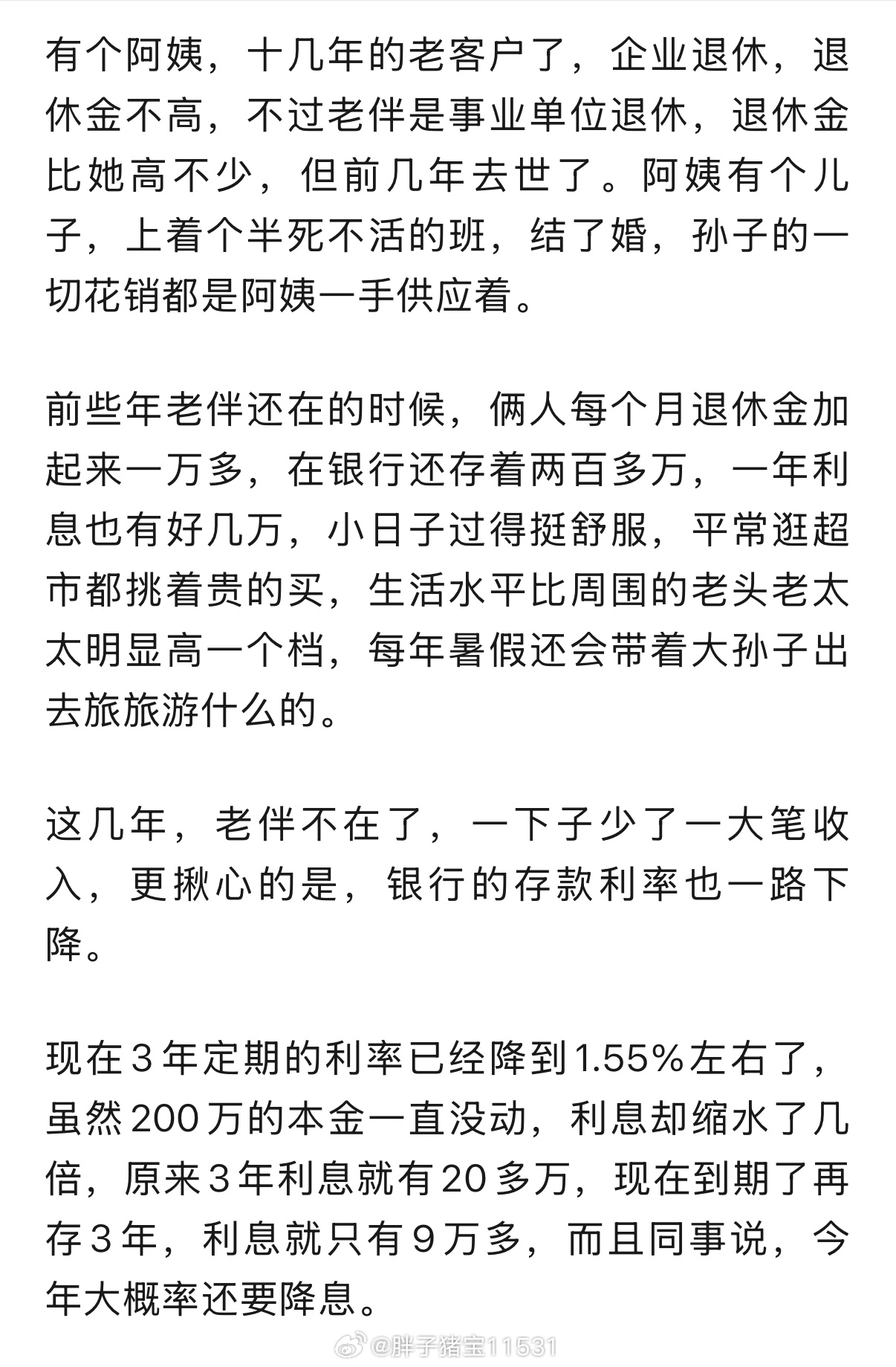 这不是也是老闫的痛点吗,我的收入还不错啦,但是儿子儿媳妇要靠我贴补啊老同志们怎么就不能阿Q些,儿孙自有儿孙福,养儿子不够,还要帮着儿子养孙子但是利息越来越低,真的也很痛哎靠利息养老是别想了