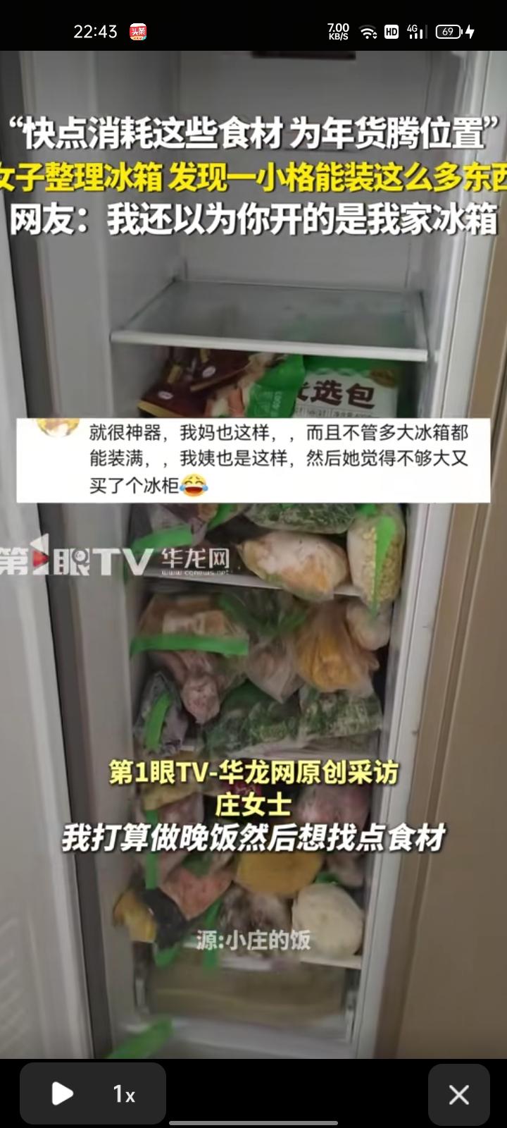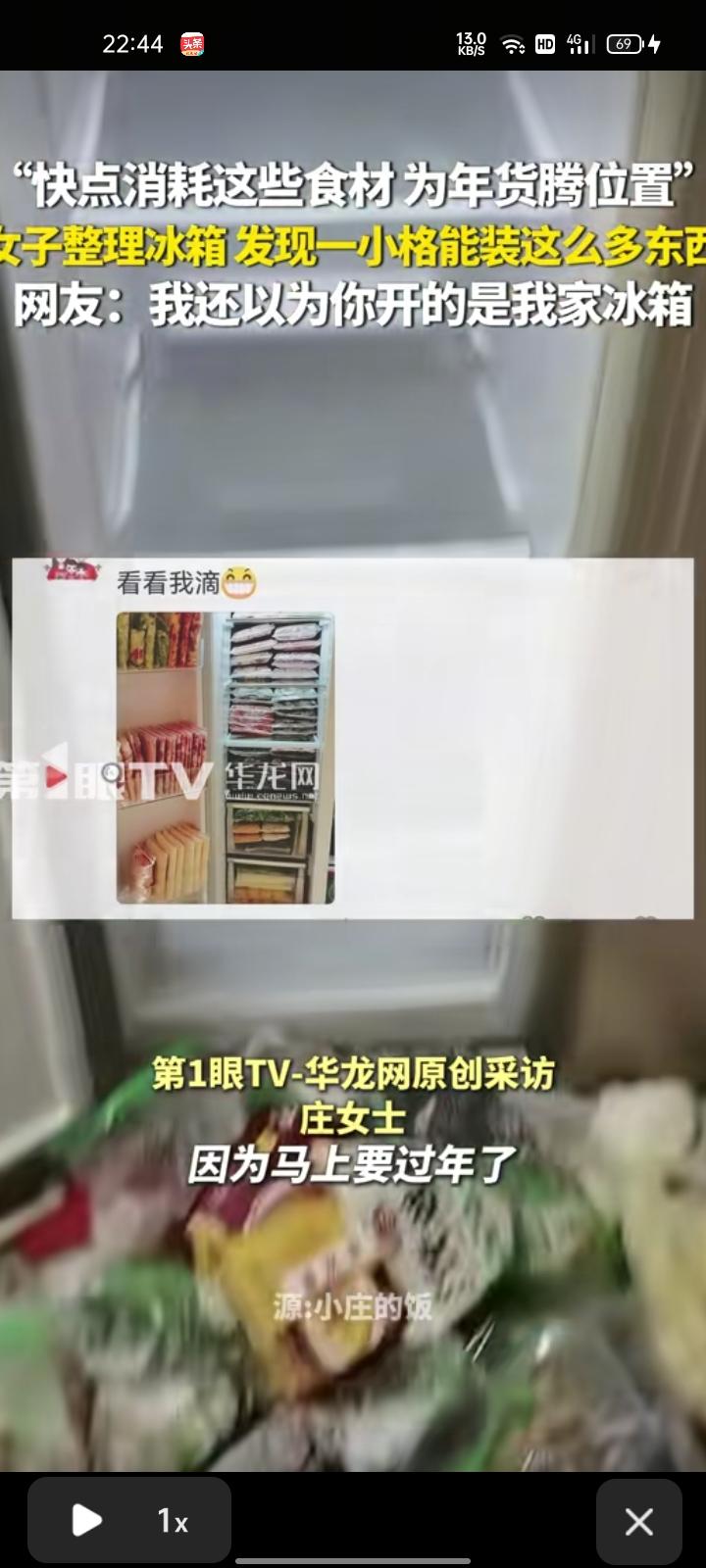 1月14日,黑龙江哈尔滨。女子晒视频表示,自己打算做晚饭后找点食材,整理冰箱时,发现一小格能装这么多东西,太多了只能放在地上翻找。快要过年了,家里肯定会准备一些年货,如果不尽快消耗,就没地方放了。