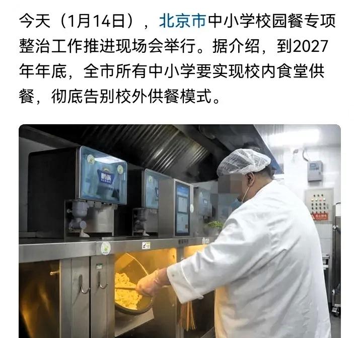 官宣了!明年年底, 北京所有中小学告别校外供餐, 全部实行学校食堂为师生供餐。 这一消息在网上, 引起了广泛的学生和家长关注。 其实家长们纠结的从来不是供餐形式,而是孩子能不能吃得安全、吃得热乎、吃得营养。 校外供餐本质就是大规模校园配送,食材来源是否合规、运输环节有没有保温措施、送到孩子手里会不会变凉,这些都是悬在家长心头的问题。遇到雨雪天气,餐食延误更是常事,孩子吃了凉饭,家长只能干着急。 反观学校食堂,优势确实很实在。明厨亮灶实时监控,食材采购全程可溯源,从清洗、烹饪到分餐,每一步都在监管范围内,安全更有保障。 而且食堂就在校内,现做现吃,能最大程度保证餐食温度和新鲜度,还能根据孩子的生长需求搭配荤素,比校外供餐更贴合学生的饮食需求。 当然也有家长顾虑,学校食堂会不会菜品单一,孩子不爱吃?其实这个问题不难解决,学校可以定期征集学生和家长的意见,每周公示菜单,甚至设置“菜品投票区”,让食堂的饭菜更合孩子胃口。 说到底,这事儿的核心根本不是“食堂”还是“外卖”,而是把孩子的用餐健康和安全放在第一位。北京这波操作,精准戳中了家长们的痛点,也给其他城市提供了一个值得参考的方向。