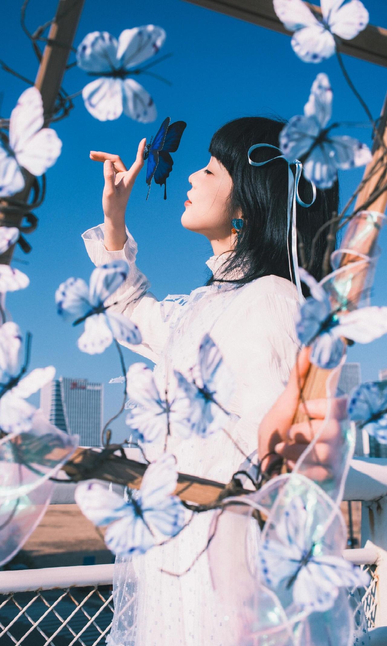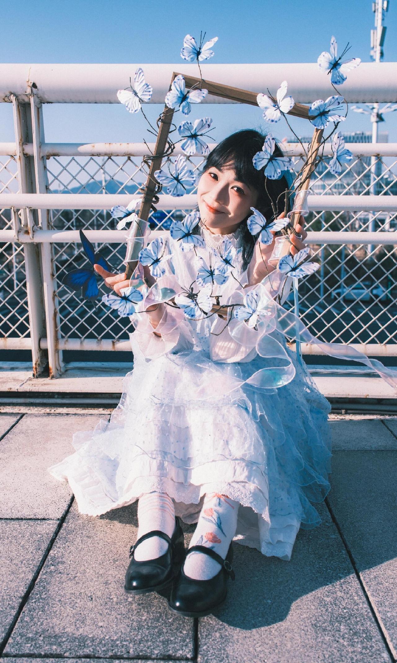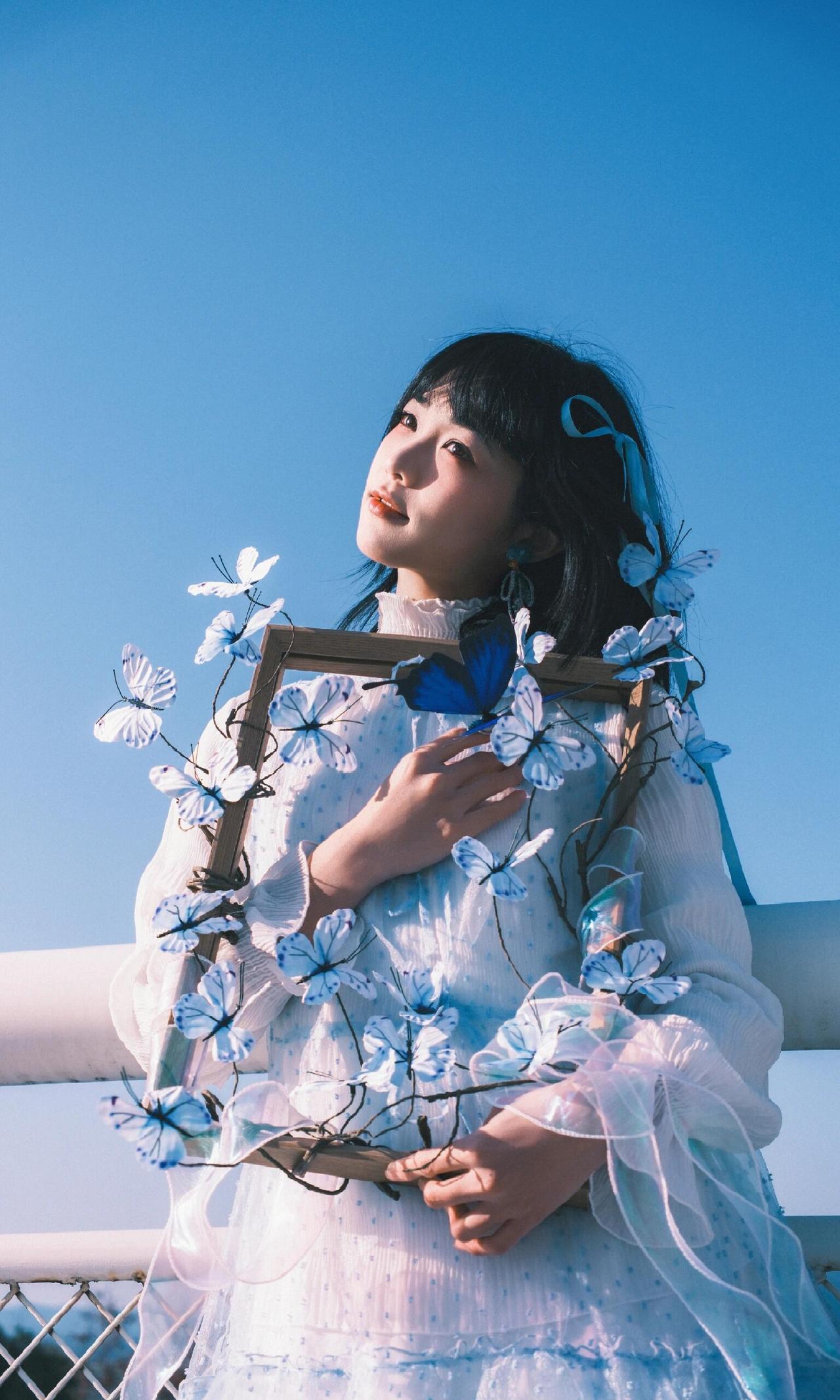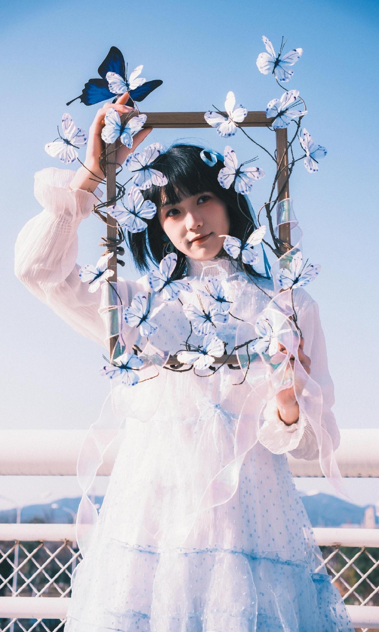 该画面以中景构图展现人物与道具的整体融合,人物双手环抱相框的姿态,让道具成为身体的延伸,强化了人与环境的关联性。背景中虚化的远山与白色栏杆形成简洁的环境层次,既交代了户外场景,又不会抢夺主体视觉重心,使画面的空间感得到合理呈现。 色彩搭配上,蓝白主色调贯穿始终,人物裙装的浅蓝渐变与背景蓝天的色调形成呼应,蝴蝶装饰的蓝色斑点成为画面的视觉亮点,让色彩节奏更具韵律。光线采用自然光漫射光拍摄,人物面部无明显阴影,肤质表现细腻,纱质服饰的轻薄质感也被完美展现。 问题在于人物手部的姿势稍显僵硬,手指的摆放缺乏自然的曲线感,影响了画面的柔美氛围。同时,相框左侧的蝴蝶装饰在画面中略显孤立,若调整道具位置让装饰分布更均匀,可让构图的平衡感更强。整体而言,作品的环境融合度较高,仅在细节姿态的把控上需进一步优化。