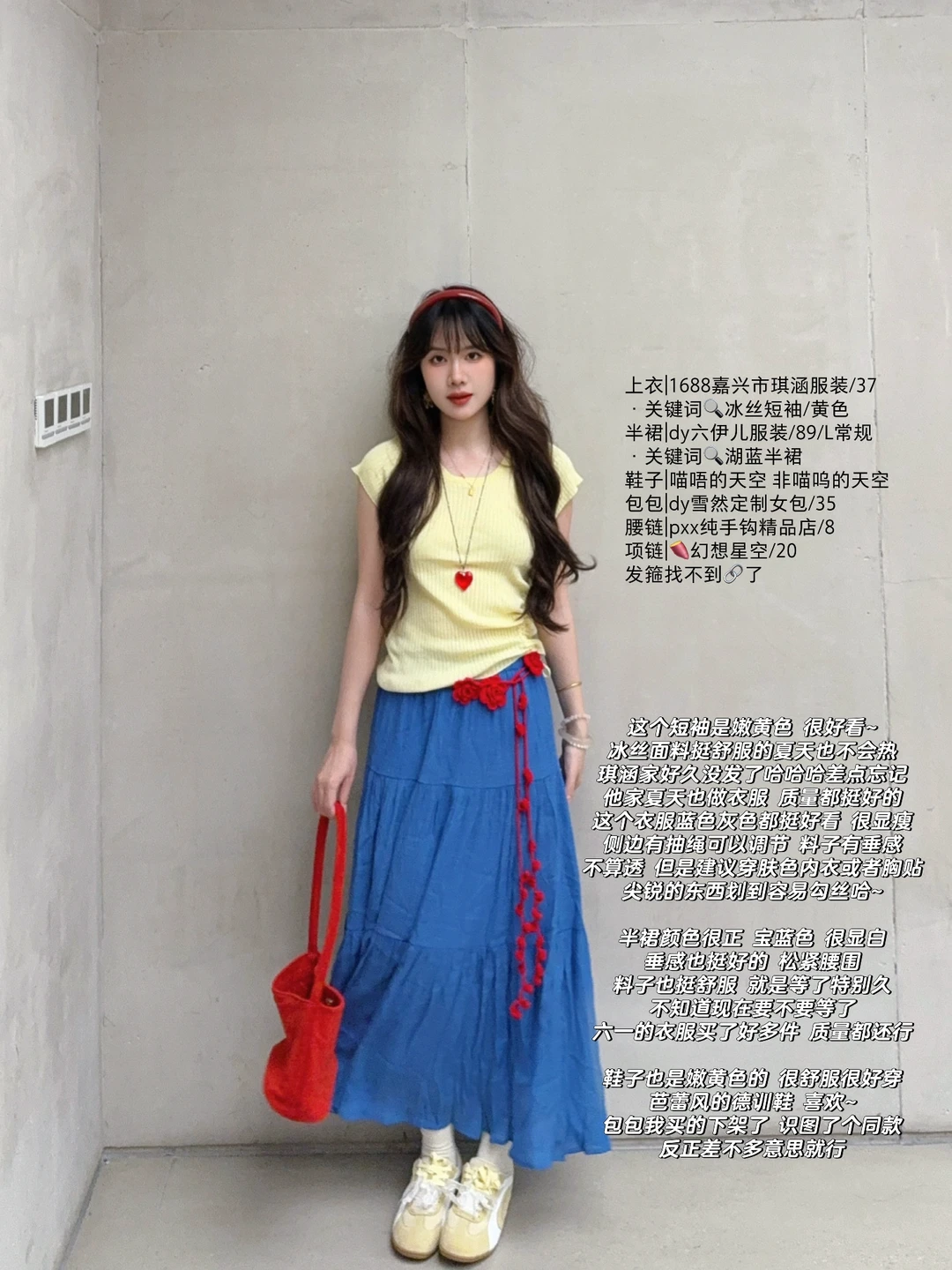 168/107 很适合迪士尼的一套 日常又好看 单品也可以重复搭配 不算是次抛衣服哈虽然很便宜 黄色➕蓝色➕红色可以随意组合 基本上就是白雪公主的配色~ 撞色系很适合拍照 很出片 但是这套也很舒服 日常穿也没问题 兼顾了好看和舒适~ 上衣也可以搭配白色米白色的裙子或者裤子 这个裙子也可以搭配红色白色黑色的上衣 鞋子也可以搭配红色黄色单鞋或者芭蕾风的鞋子