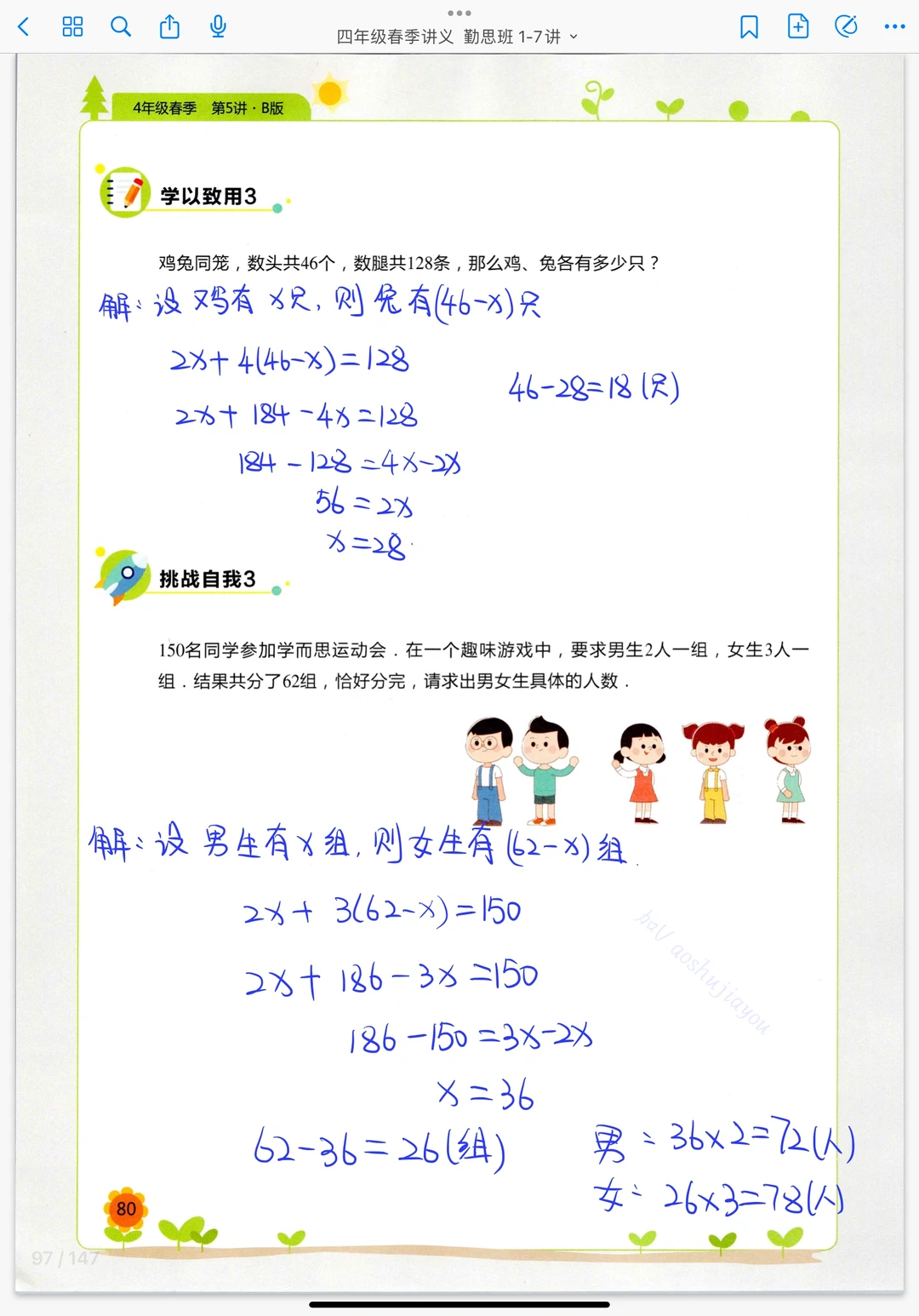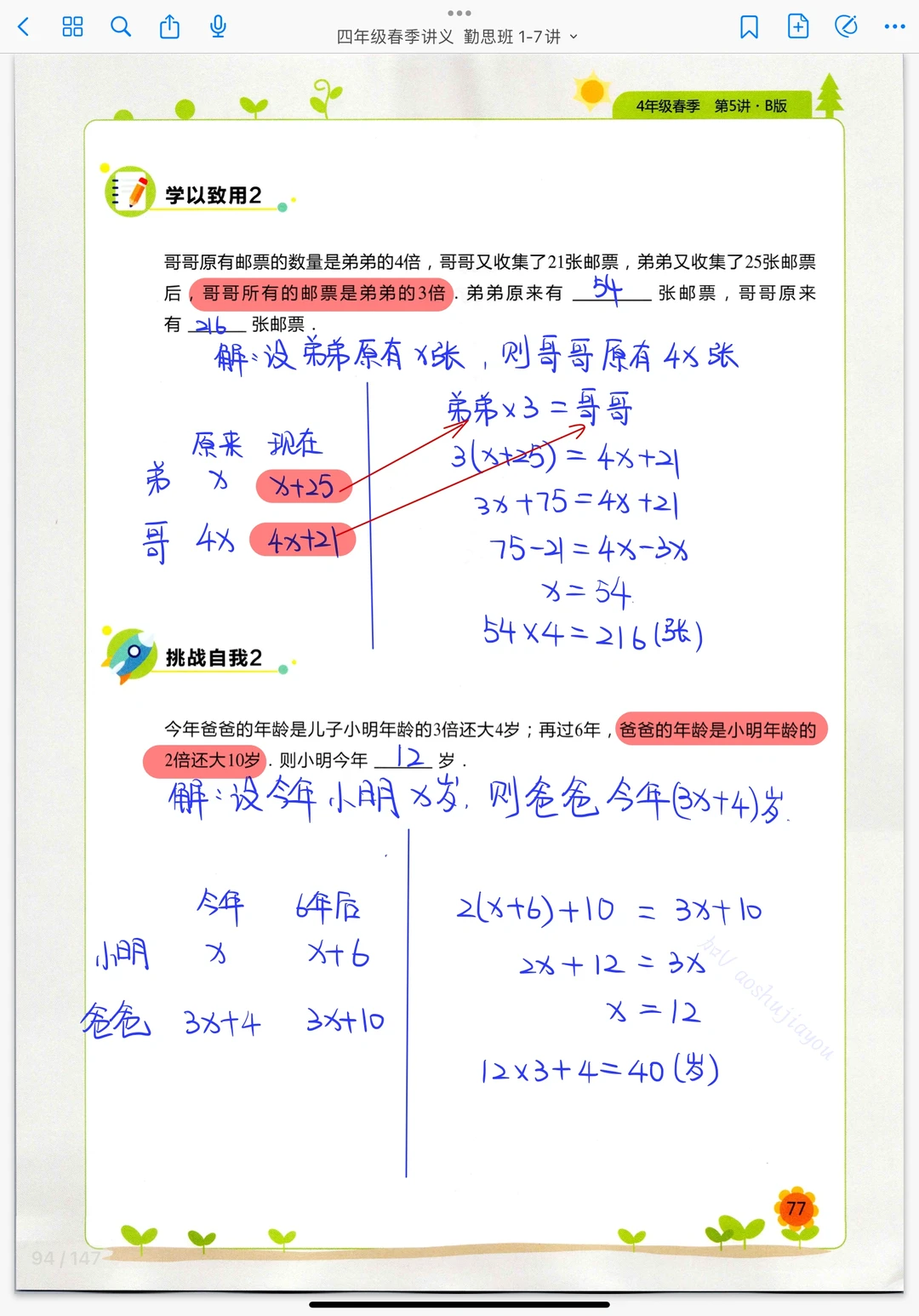 《列方程解应用题》四年级春季奥数课堂笔记