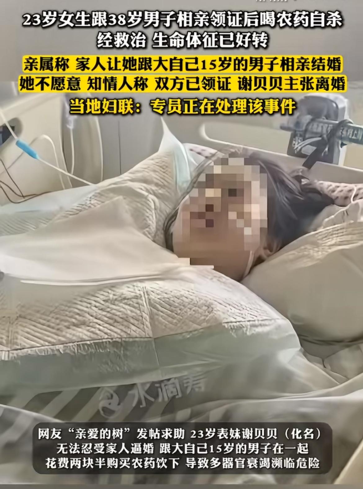23岁女生与38岁男子相亲后喝农药自杀,这事儿太让人痛心!女生被母亲逼婚,辛苦攒下的6万元还被拿走,这换谁都崩溃。她买了2.54元的农药结束生命,可见内心绝望到极点。 从见面到领证隔几个月,她领证后还总提离婚,说明打心底不愿意。好在1月15日上午生命体征好转,但仍在重症监护。她母亲说买房找女儿借的钱,男方姐姐也表示女方要离会配合。希望妇联能妥善处理,也希望女生能彻底走出阴霾。