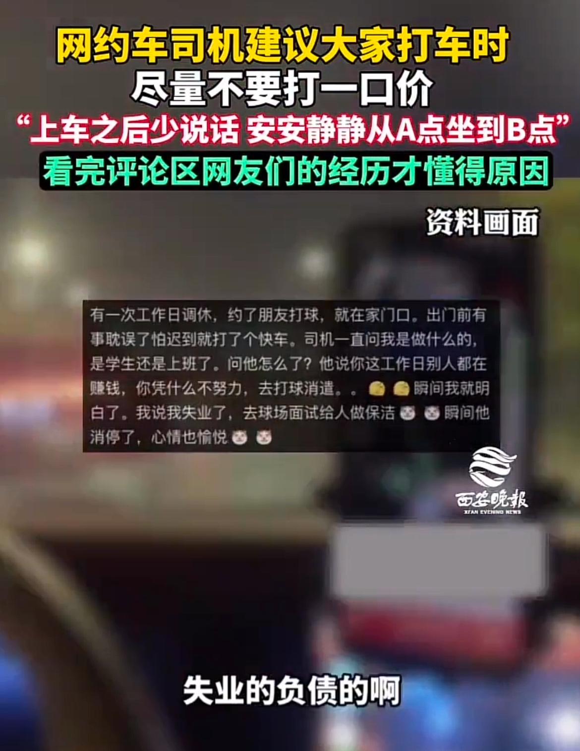 现在好多人打车时喜欢和司机唠嗑,不过有网约车司机建议少说话,安安静静到地就行。为啥呢?现在很多负债的、失业的都涌入这个行业,他们压力山大。就好比之前我打车,司机一路上唉声叹气,说自己创业失败欠了一屁股债,没办法才来开网约车。一路上听他倒苦水,我这心情也跟着沉重。所以啊,咱打车时少说话,让司机专注开车,也给自己留个清净,大家都能舒舒服服从A点到B点。