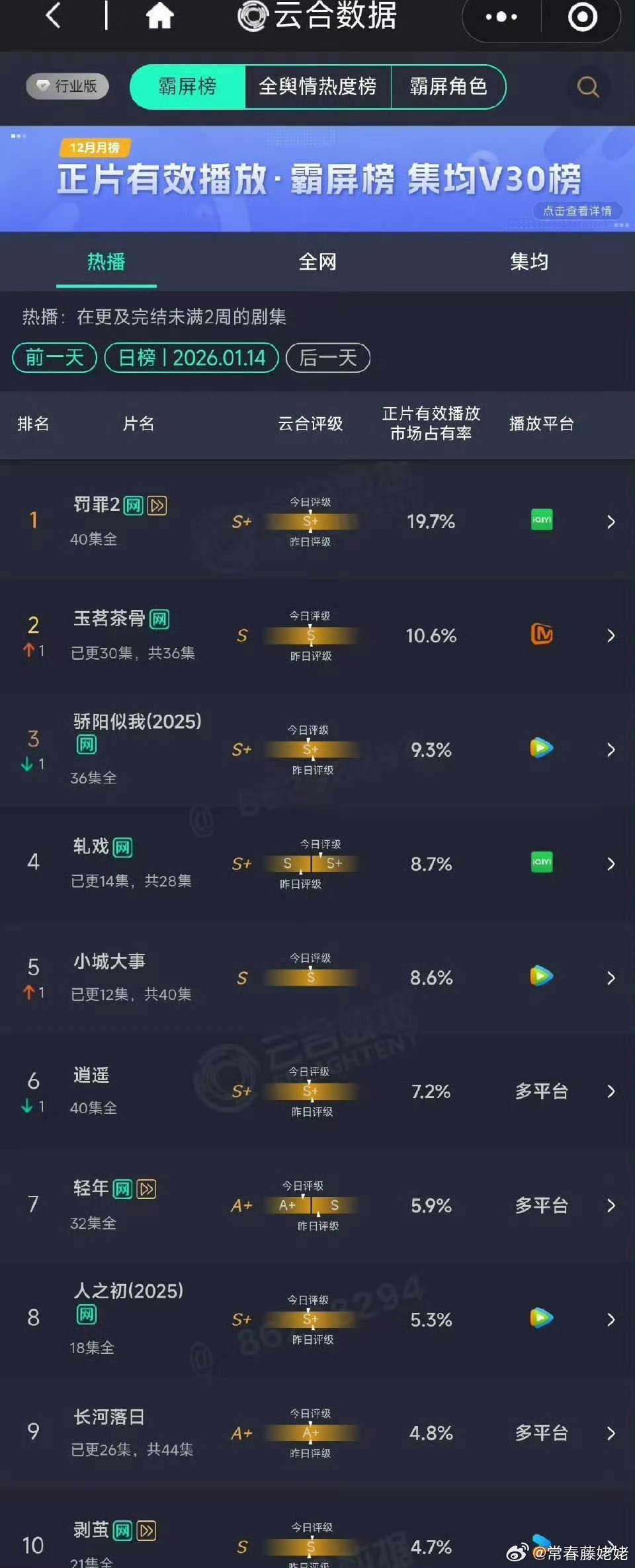 最近播剧,灯塔和云合也正常了,也没剧来让这些数据公司出现各种bug和捏数据了!最