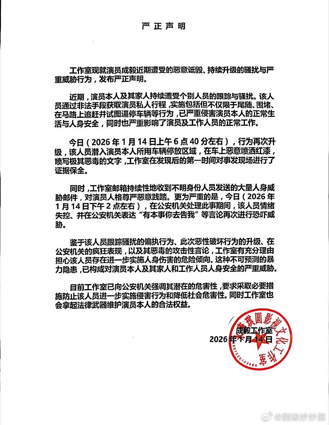 威胁、恐吓、骚扰、跟踪、车上喷红漆……成毅啥时候在内娱树了这么大的敌吗?都敢这么上手段好可怕啊工作室和欢瑞都出来发声明了
