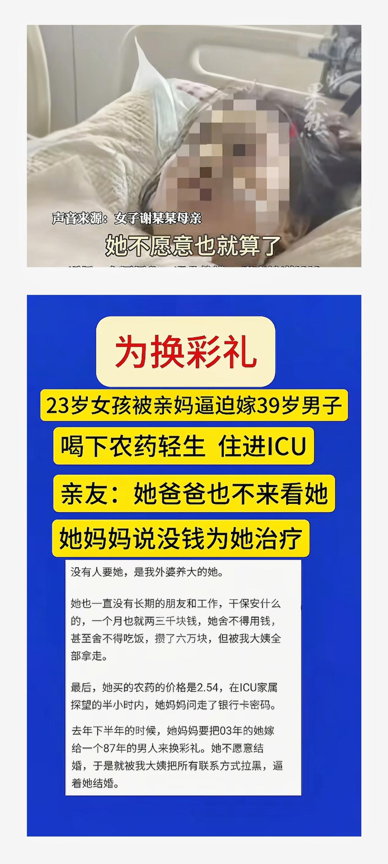 湖南益阳,被逼婚嫁给39岁男人的23岁女孩,叫小林,喝农药后,至今还在ICU!她是个可怜人,从小跟着外婆长大,父亲有暴力倾向,母亲对她不管不顾,早早辍学的她,一个人在外打工谋生,当过保安,做过零工,省吃俭用攒下6万块钱,那是她能给自己一点安全感的全部积蓄,这笔钱,却被母亲一声不吭地拿走了。 直到母亲逼着她嫁给39岁的男人,她才彻底崩溃。 这真是一场以生命为代价的抗争! 2025年下半年,母亲突然找到她,说已经给她物色好了一门亲事,对方是个39岁的男人,家境看着还行。 小林明确拒绝,她才23岁,想自己找喜欢的人,过自己想要的生活,母亲根本不听她的意愿,见她不松口,干脆拉黑了她的联系方式,用断绝往来的方式逼她就范。 一边是被夺走的积蓄,一边是至亲的逼迫与孤立,看不见出路的小林,在1月7日晚上,买了一瓶仅售2.54元的“敌草快”,含泪灌进了嘴里。 喝下农药的瞬间,剧烈的腹痛和呕吐感席卷而来,她强撑着挨了5个小时,才被人发现送往仙桃第一人民医院急救,但当地的医疗条件有限,面对她急速衰竭的器官,医生束手无策,只能紧急将她转往武汉协和医院,送进了重症监护室。 每天1.2万元的治疗费,像一座沉甸甸的大山,压得帮她的亲戚喘不过气,小林的表姐说,如今的治疗费,全是她母亲刷着信用卡在硬撑,而小林的亲生父母,不仅对女儿的生死不闻不问,母亲去ICU探视时,居然还在追问女儿的银行卡密码。 躺在病床上的小林,意识尚且清醒,她一遍遍说:“我想活”,但每一次的治疗,都像是在鬼门关走一遭。 1月11日,走投无路的表姐只能在网上发帖求助,发起水滴筹,目标金额20万元。1月13日,水滴筹工作人员证实了小林的中毒情况和筹款项目的真实性。1月14日,仙桃市妇联也回应已经找到当事人,正在跟进处理此事。 谁能想到,一个年轻女孩,只是想为自己的婚姻争取一点自主权,却被逼到了要以命相搏的地步,那6万块钱,是她的底气,却被母亲当成了逼婚的筹码,那句“我不嫁”,是她的心声,却被至亲当成了耳旁风。 目前,小林还在ICU里苦苦支撑,所有人都盼着奇迹能降临,盼着这个受尽委屈的女孩,能熬过这一劫,未来能真正为自己活一次。 太可惜了,在小林还对亲情抱有期待的日子里,她还曾想着好好打工赚钱,能让自己和外婆过上安稳日子。