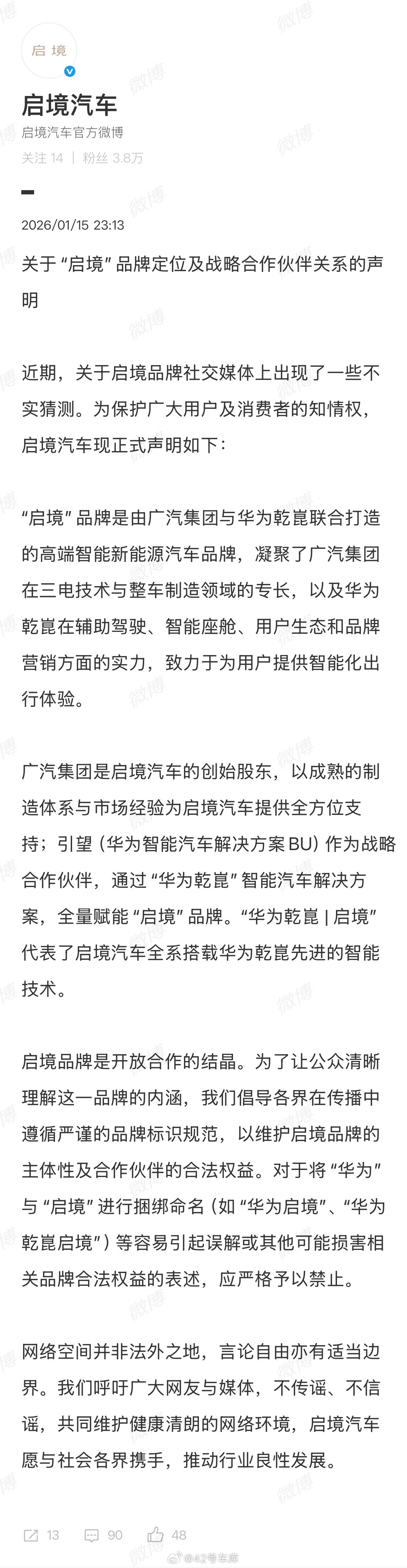 启境汽车昨晚发了篇声明,表示「华为乾崑 | 启境」代表了启境汽车全系搭载华为乾崑先进的智能技术,不是品牌名。因此捆绑命名(如「华为启境」「华为乾崑启境」)等容易引起误解或其他可能损害相关品牌合法权益的表述,应严格予以禁止。42how启境