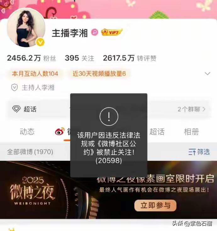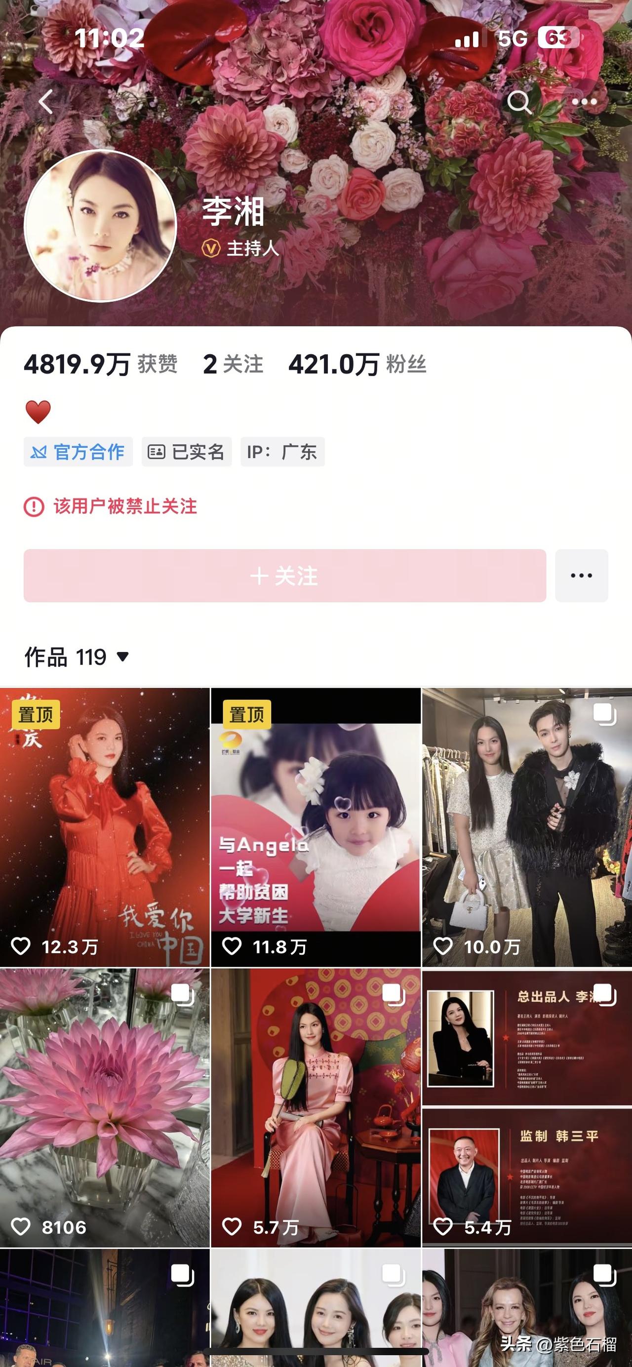 重磅消息:由于违反相关法律法规和社区公约,主持人李湘的抖音、微博、小红书等账号目前已经被禁止关注。 看来不管明星也好、网红也罢,该遵守的法规还是要遵守,否则都会逃脱不了被封禁的后果。 大家觉得李湘被封是什么原因?欢迎评论区交流! (图片来源网络)
