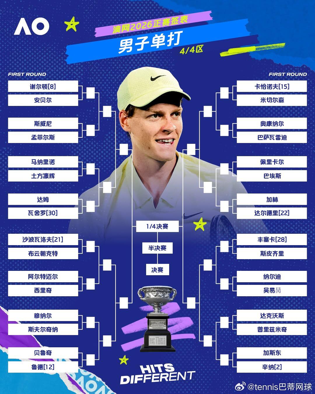 好酷啊,这拍的充分展示了肌肉线条!本届澳网签运也尚可,第一轮将面对沙波🇨🇦,第二轮可能可能是阿尔特迈尔🇩🇪这个四分之一区还有吴易昺,不过想实现德比比登天还难这很澳网澳网2026ATP