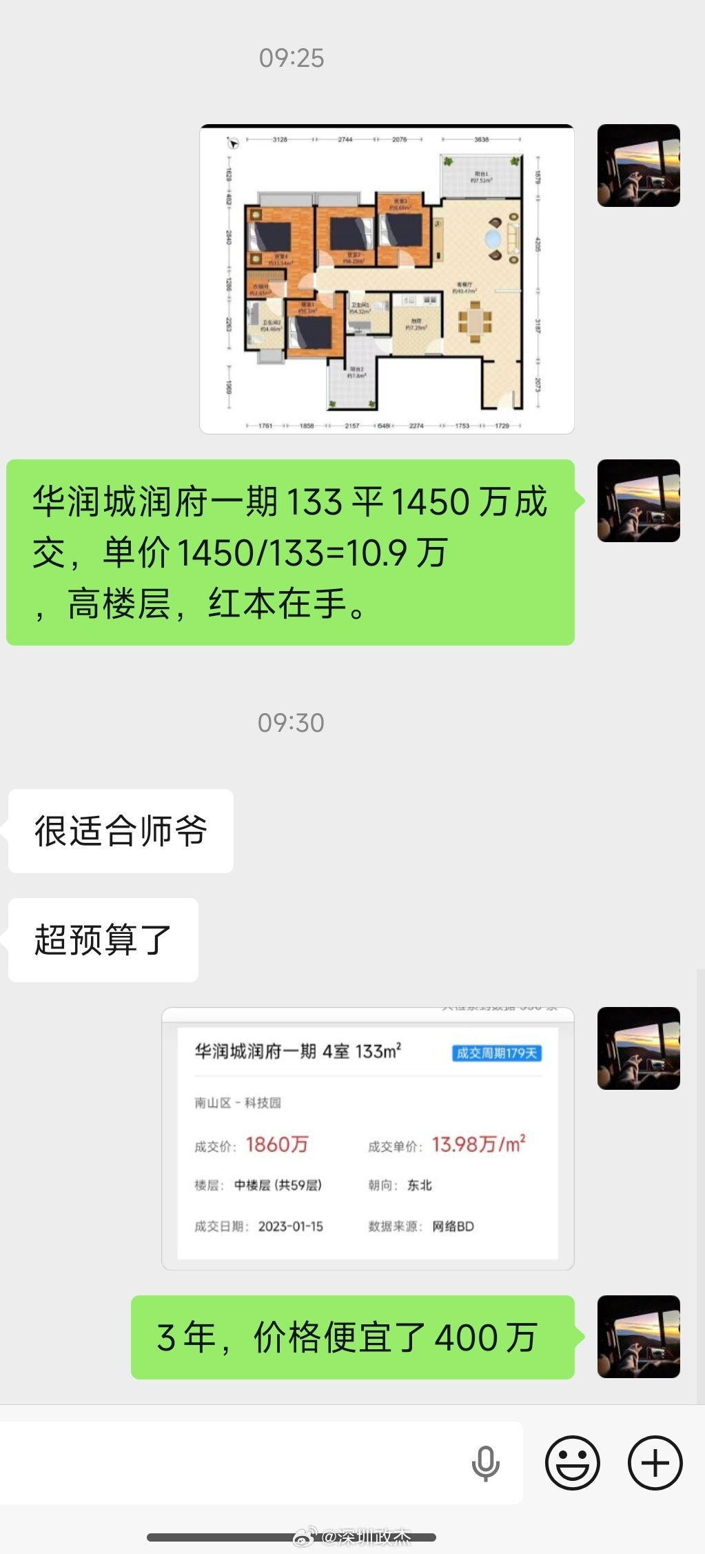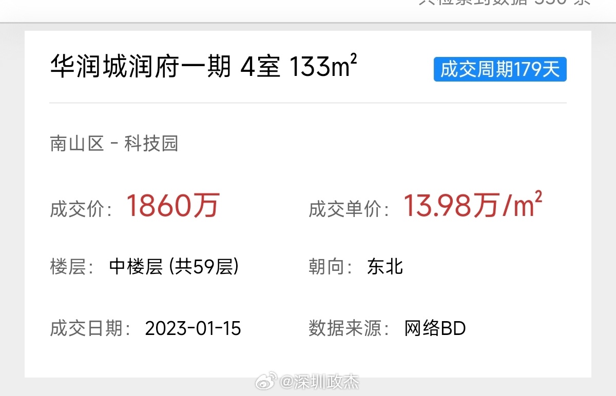 润府一期133平1450万成交,单价1450/133=10.9万,高楼层,红本在手,东北朝向。阳台景观参考图4,实际楼层更高。 深圳