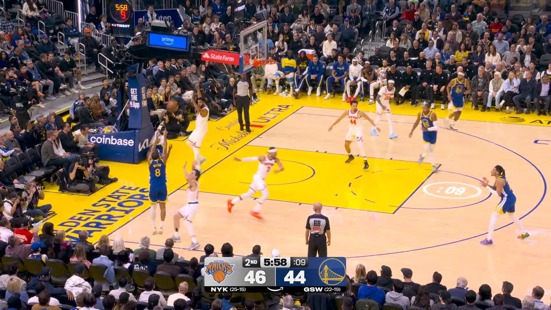 巴特勒高难度助攻梅尔顿投进超前三分!尼克斯vs勇士