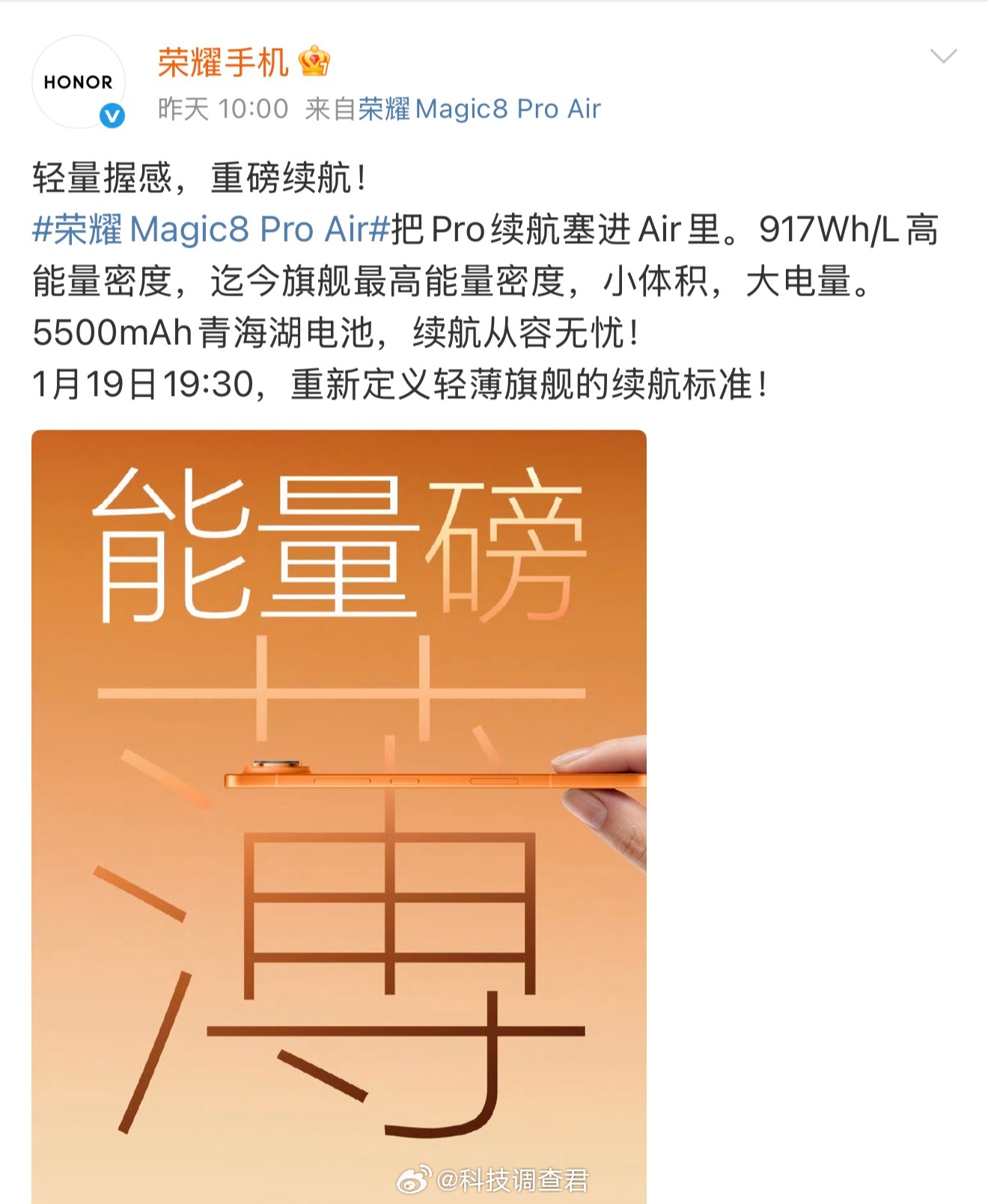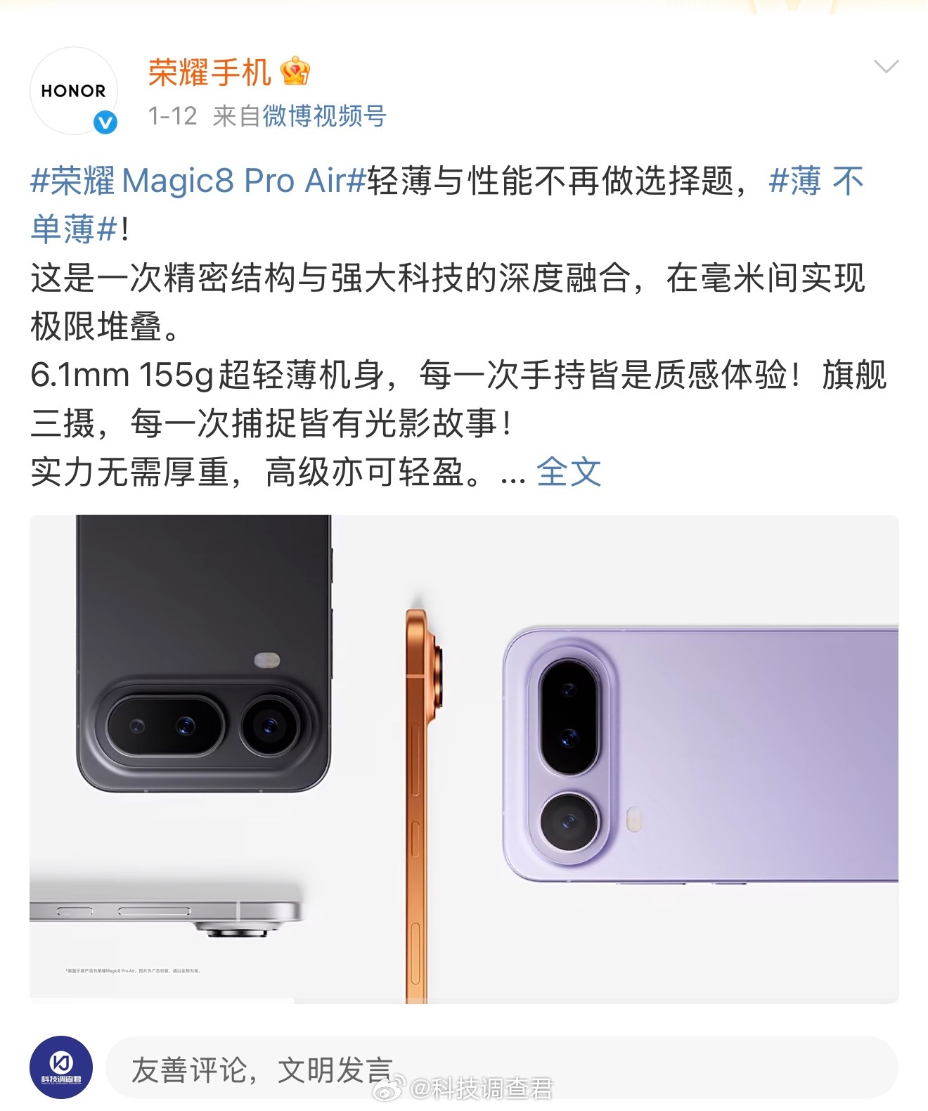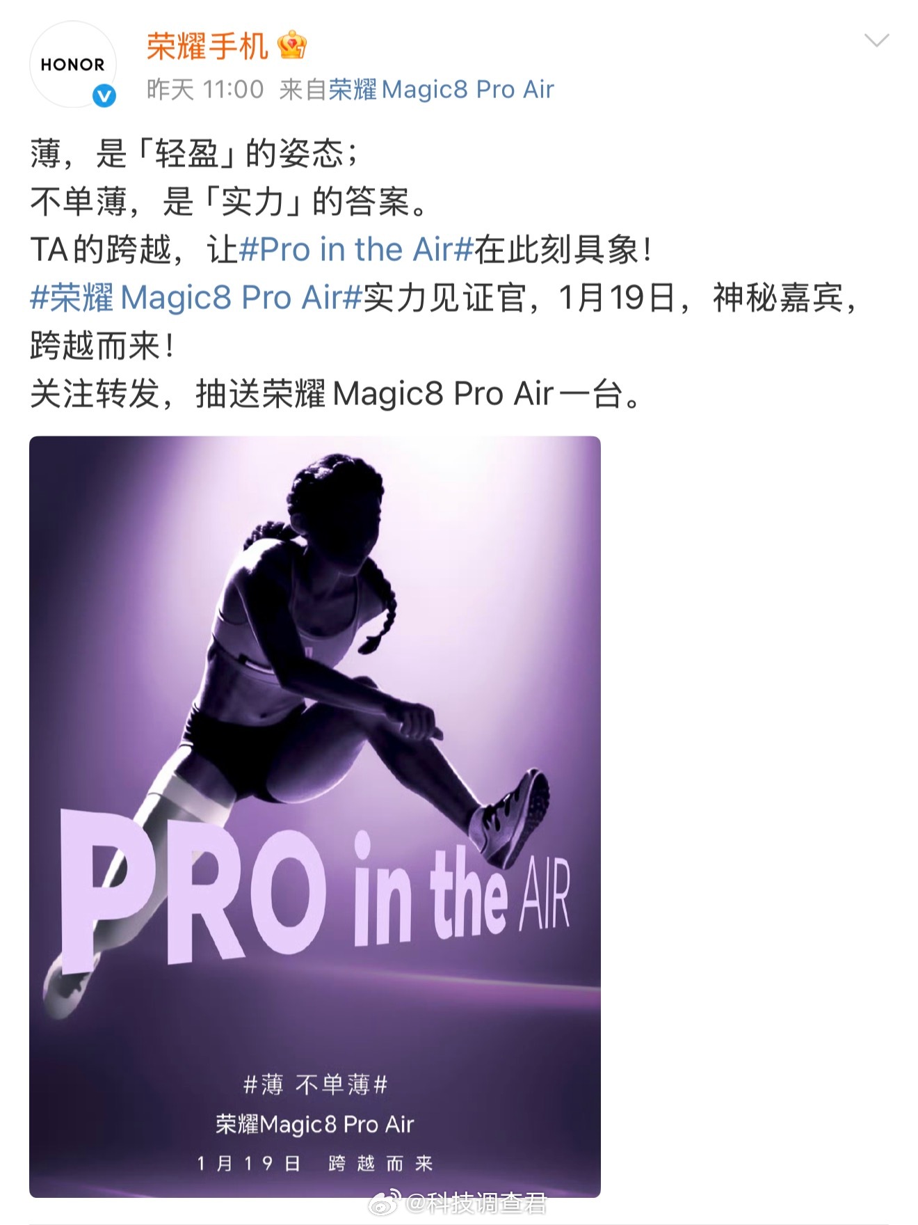 这配色玩明白了!“仙紫”和“轻橙”,一看就是给年轻人准备的,活力值拉满。吴艳妮将出席荣耀Magic8 Pro Air发布会,她本身就是“活力潮流派”的代表,这波精神属性和产品配色双重绑定,荣耀这波营销我服。1.19,期待真机颜值!