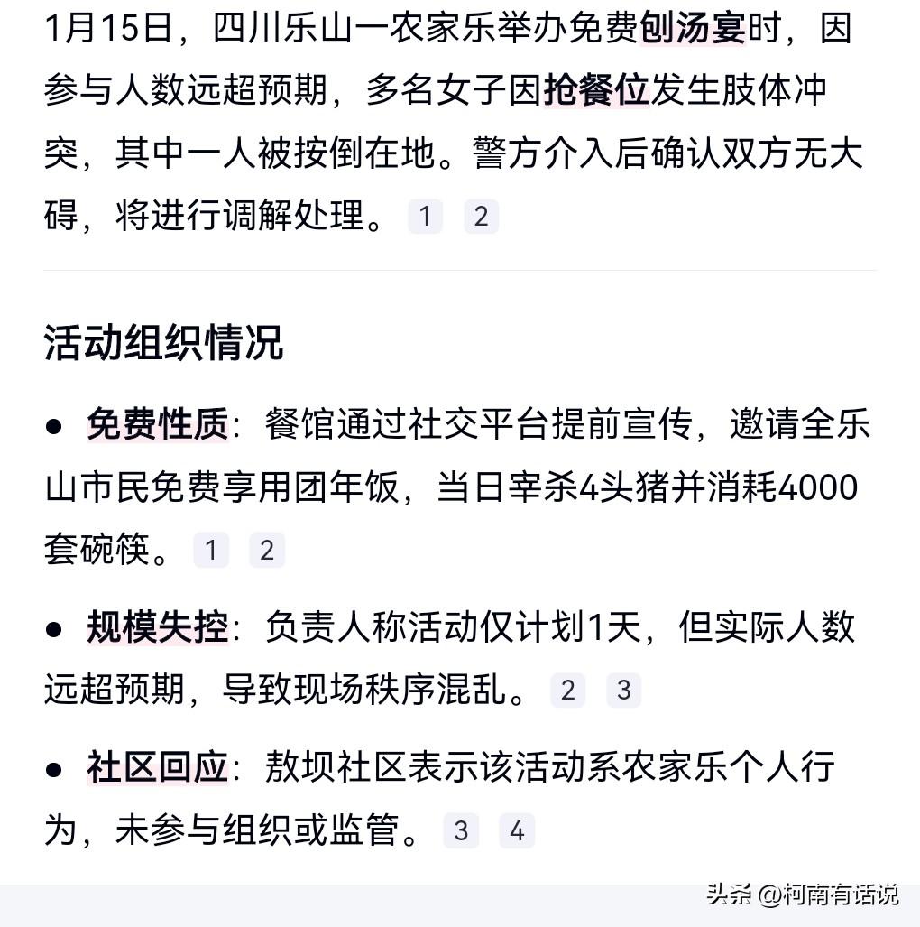 人果然是群居生物啊,干什么事情都喜欢凑热闹。 近日,有一个女孩邀请网友杀连年猪,结果造成了轰动,全国各地都开始搞这种形式。 但是去的人太多了,根本就忙不过来。 这个事情必须要靠村里面解决,个人的能力实在是太小了。 1月15日,乐山多名女子刨汤宴抢位引发冲突。 竟然还引发打架事故,这就真的说不过去了。