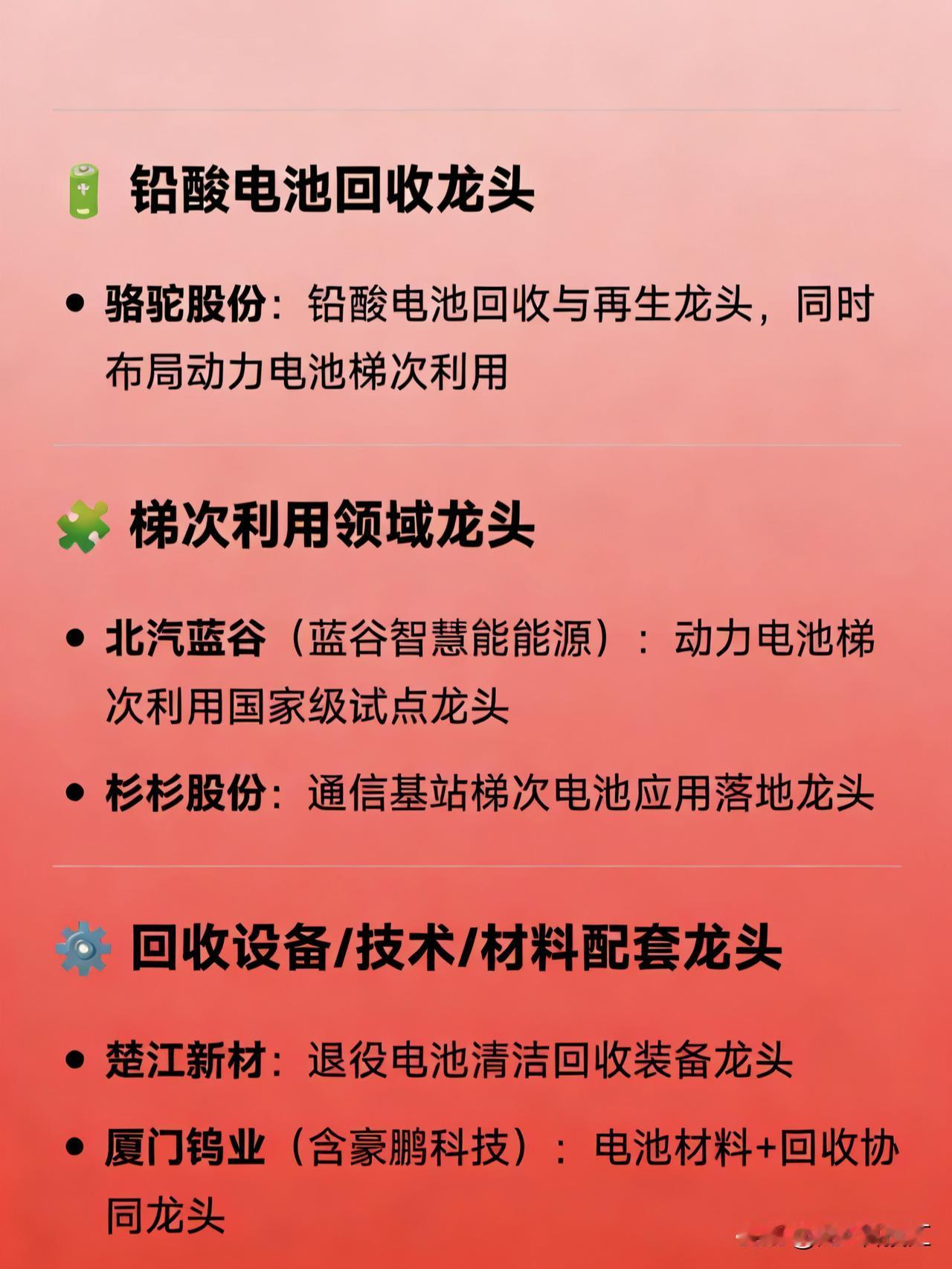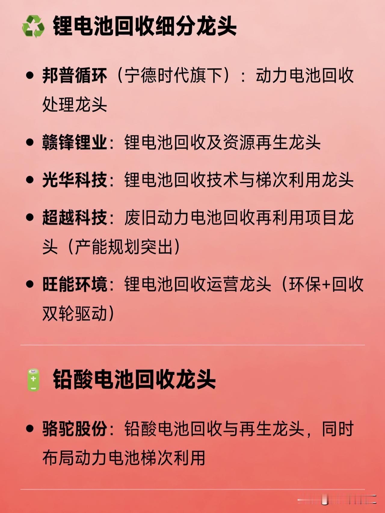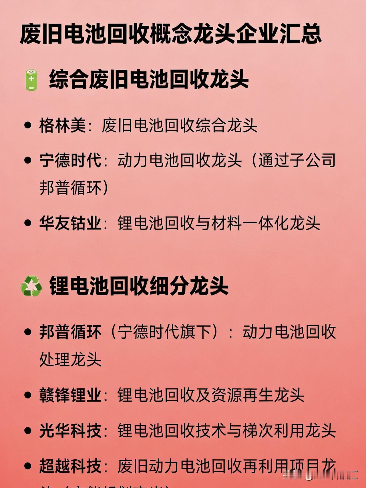 废旧电池回收概念龙头企业汇总 🔋 综合废旧电池回收龙头 格林美:废旧电池回收综合龙头 宁德时代:动力电池回收龙头(通过子公司邦普循环) 华友钴业:锂电池回收与材料一体化龙头   ♻️ 锂电池回收细分龙头 邦普循环(宁德时代旗下):动力电池回收处理龙头 赣锋锂业:锂电池回收及资源再生龙头 光华科技:锂电池回收技术与梯次利用龙头 超越科技:废旧动力电池回收再利用项目龙头(产能规划突出) 旺能环境:锂电池回收运营龙头(环保+回收双轮驱动)   🔋 铅酸电池回收龙头 骆驼股份:铅酸电池回收与再生龙头,同时布局动力电池梯次利用   🧩 梯次利用领域龙头 北汽蓝谷(蓝谷智慧能源):动力电池梯次利用国家级试点龙头 杉杉股份:通信基站梯次电池应用落地龙头   ⚙️ 回收设备/技术/材料配套龙头 楚江新材:退役电池清洁回收装备龙头 厦门钨业(含豪鹏科技):电池材料+回收协同龙头废旧电池回收 环保电池回收​