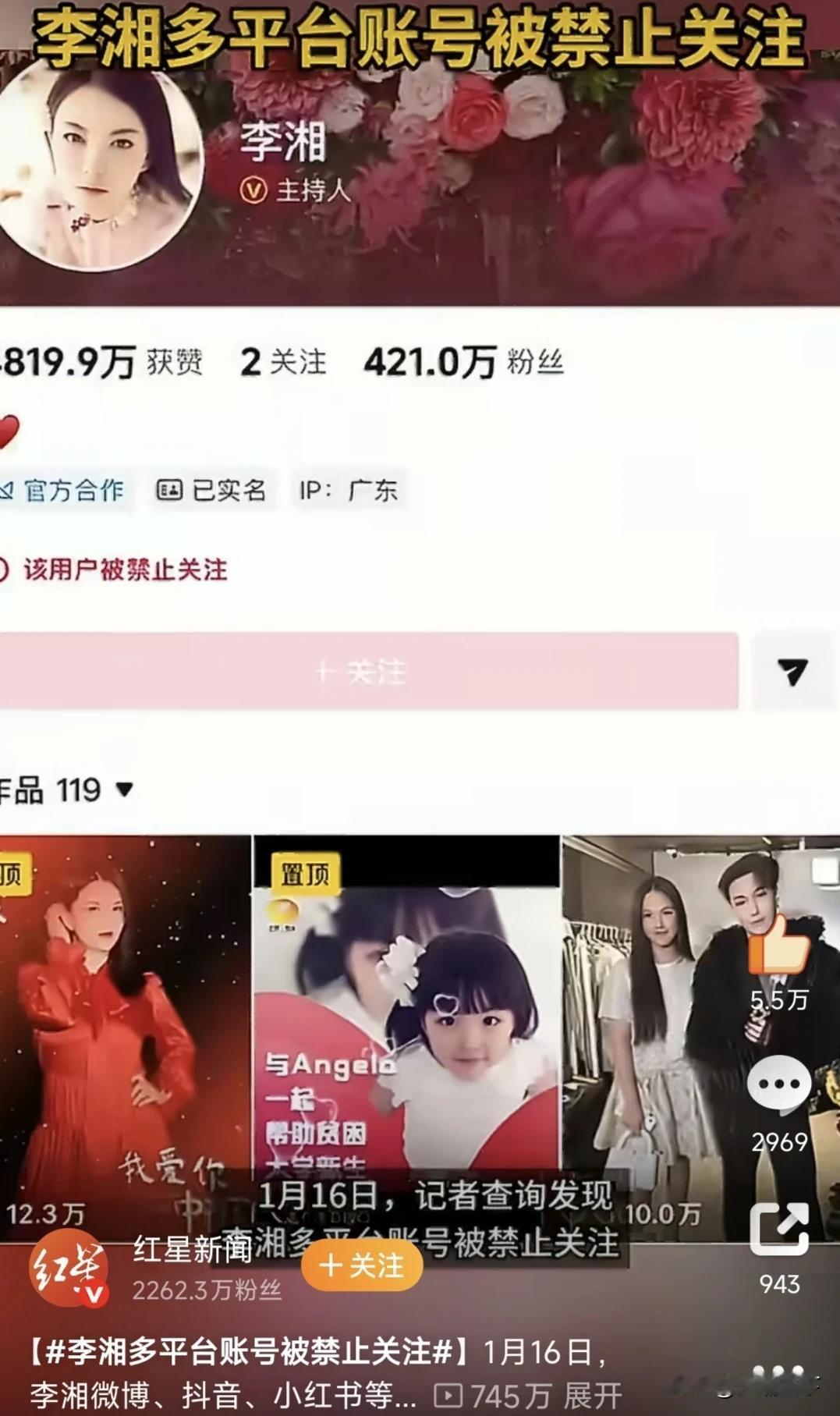 终于出手收拾她这一家子了! 前段时间闫学晶事件发生时候我就觉得:要说炫和“何不食肉糜”代表,李湘可是当仁不让的顶流[泪奔]。 通常,没原因,突发,大概率,税… 人设可以有很多种,炫富是最拧巴的那种。真的超级富豪不屑于炫,而有些人是比平常人财富多一些,但是靠富豪人设来挣钱,就拧巴了。 是不是又说错啥话了,还是偷税漏税了? 说错话会有视频曝出,她这个应该是后者但感觉是更严重的事儿,否则不会毫无预警的封,前几天还和女儿在看演唱会的。
