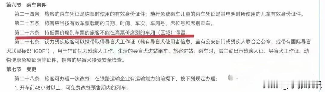 花同样的钱买站票,为什么连一等座门口都不让站? 有网友买了张高铁二等座的无座票,上车后发现车厢里人挤人,看见一等座车厢连接处挺空,就过去站着。 结果很快就被列车员盯上,明确告知他:“一等座不允许无座旅客逗留”,要求他离开。 列车员为了明示那片区域不能站人,顺手把旁边一个绿色箱子放倒了。最后,这位网友只能回到二等座车厢的连接处去站完全程。 这事一爆出来,好多人才知道原来“站票”也有规矩。12306客服和《铁路旅客运输规程》说得清清楚楚:高铁无座票(售价与二等座相同)仅限在二等座车厢使用,无论是坐还是站。如果你想去一等座区域,那就属于“越席乘车”,必须补上相应的票价差价。 说白了,规则就是一分钱一分服务。一等座卖得贵,图的就是更舒适安静的环境,铁路上规定持低票价车票的旅客不能在高票价区域滞留,也是为了保障付费旅客的权益。但想想,同样是花钱站一路,心里有点落差也难免。你怎么看?