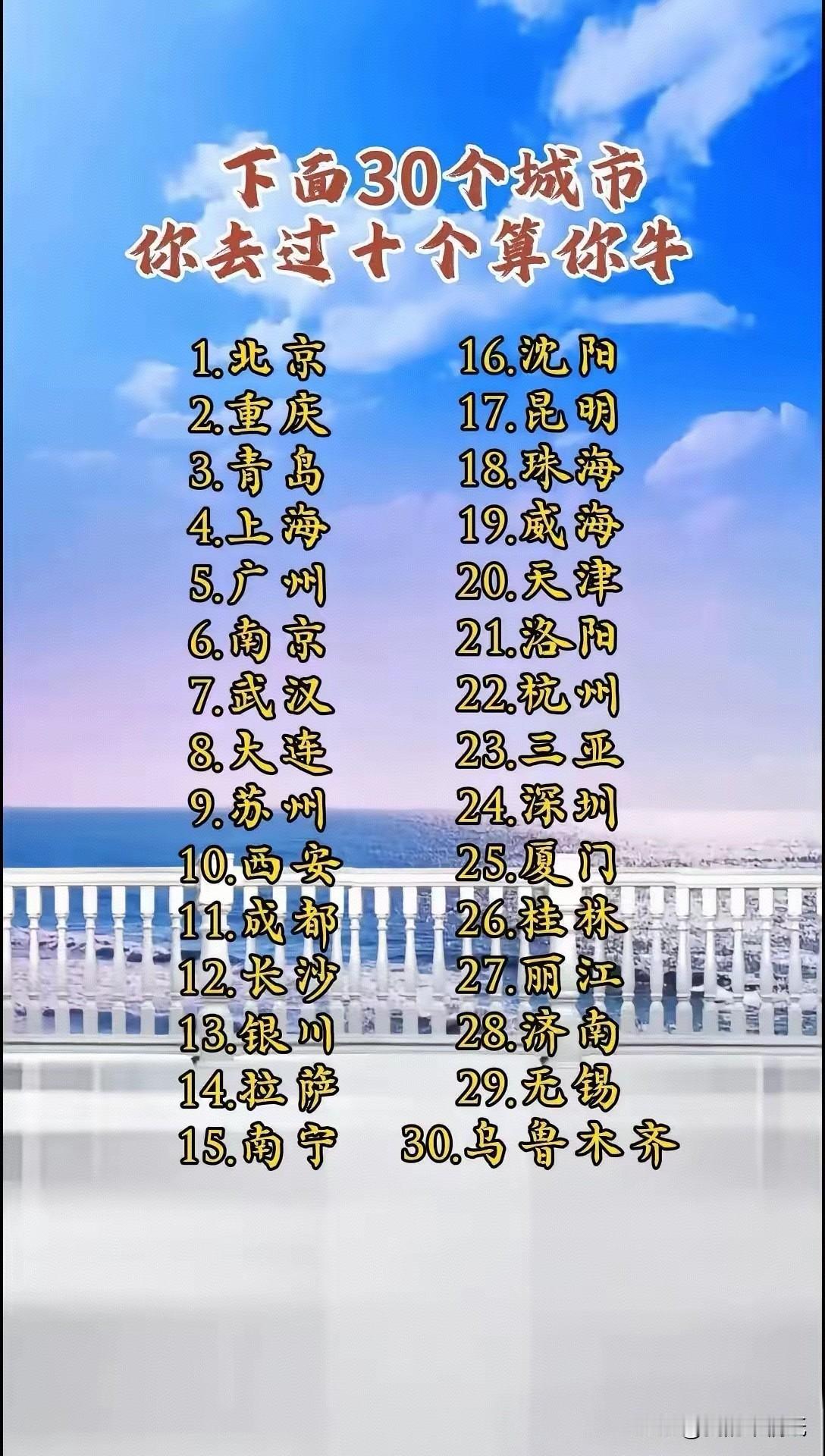 我已去过24个 唯独没去过拉萨、乌鲁木齐、威海、珠海、深圳、广州6个城市。这算不算大神级玩家? 图上说,但凡去过超过10个的,是旅游界达人! 说说,你到过几个?