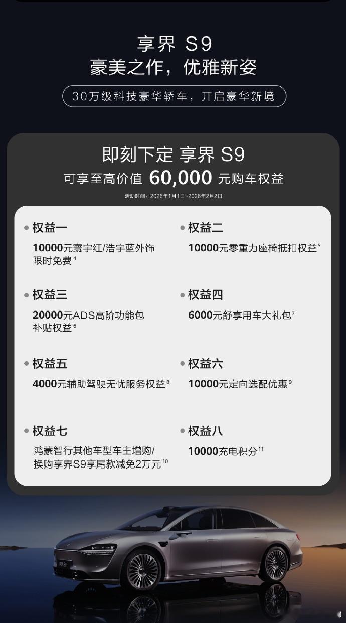 鸿蒙智行智界和享界的1月新车销售政策也发了